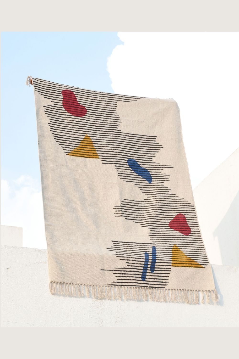 Dhurries, made using handspun Khadi, which is handwoven meticulously by diligent craftsperson from Banskho, a village in Rajasthan. Subsequently these Dhurries are handprinted in Bagru by master artisans.