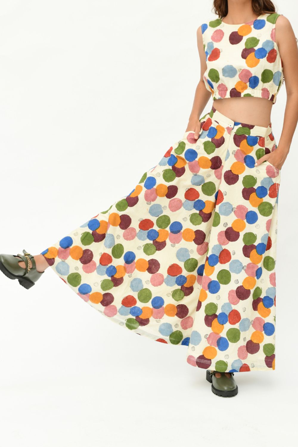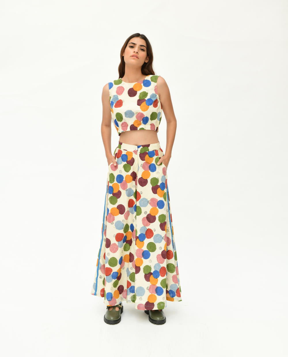 -Craft : Handblock printing .Off white base with multi colour big polka print. Wide ------Flared pants with blue taping on side.