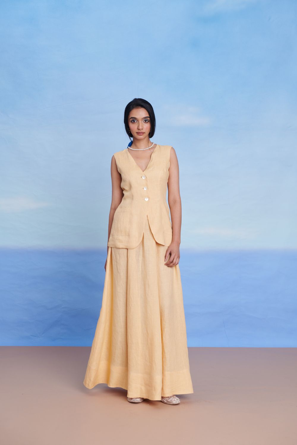 Tailored for summer sophistication, this sleeveless vest features a flattering V-neckline, princess seams for shape, and a softly flared hem that skims the hips. Crafted in 100% pure linen, it’s finished with oversized mother-of-pearl buttons and side ties that adjust at the waist for a custom fit. Style it solo or layered — this is an effortless statement piece for warm-weather days.