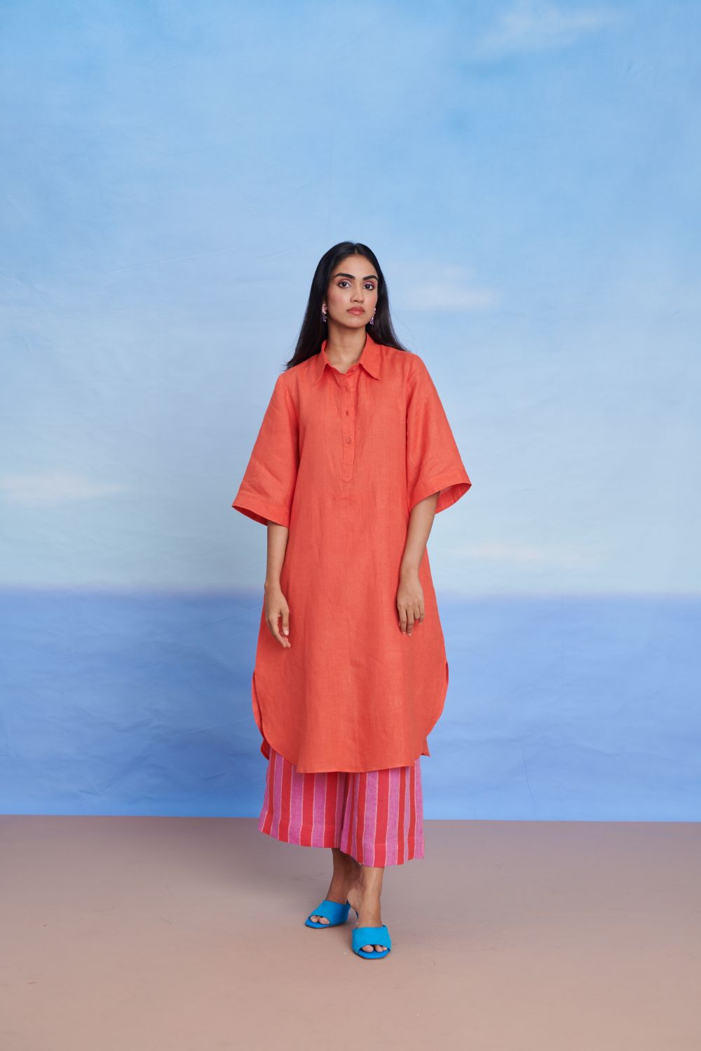 An everyday set for lightness and movement. The half-sleeve shirt kurta is cut from 100% pure linen, with a clean front placket, curved hem, and side pockets for ease. It pairs with palazzos in the same breathable fabric — relaxed, playful, and designed to flow with you through the day.