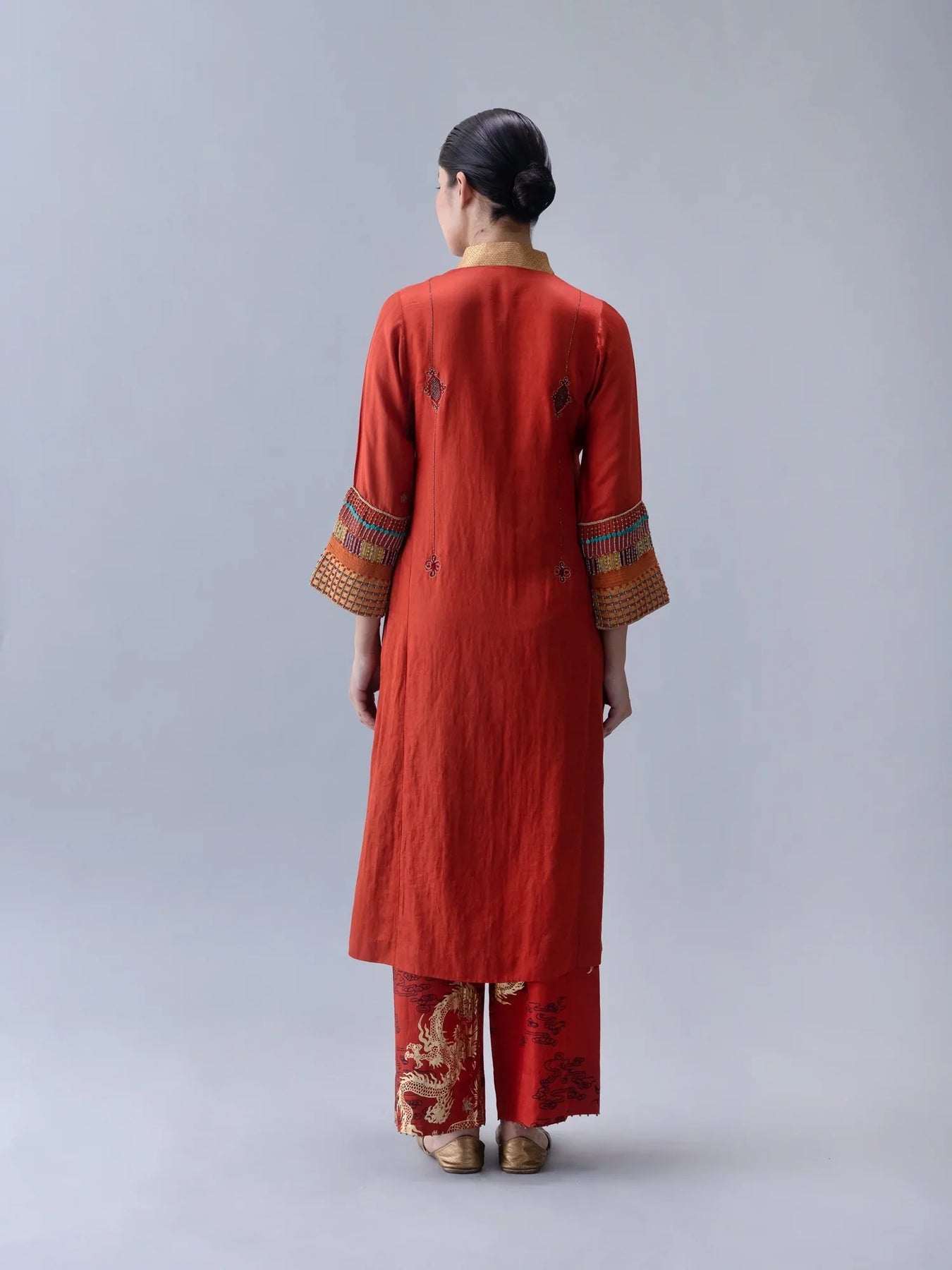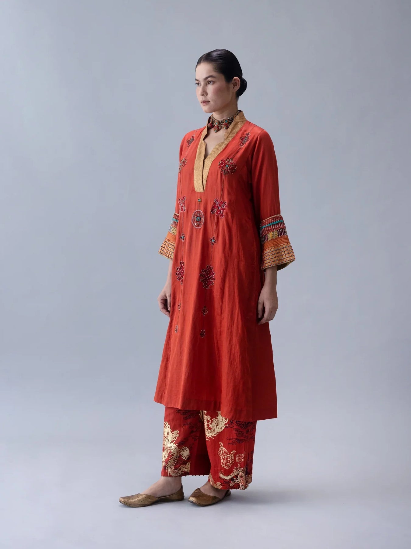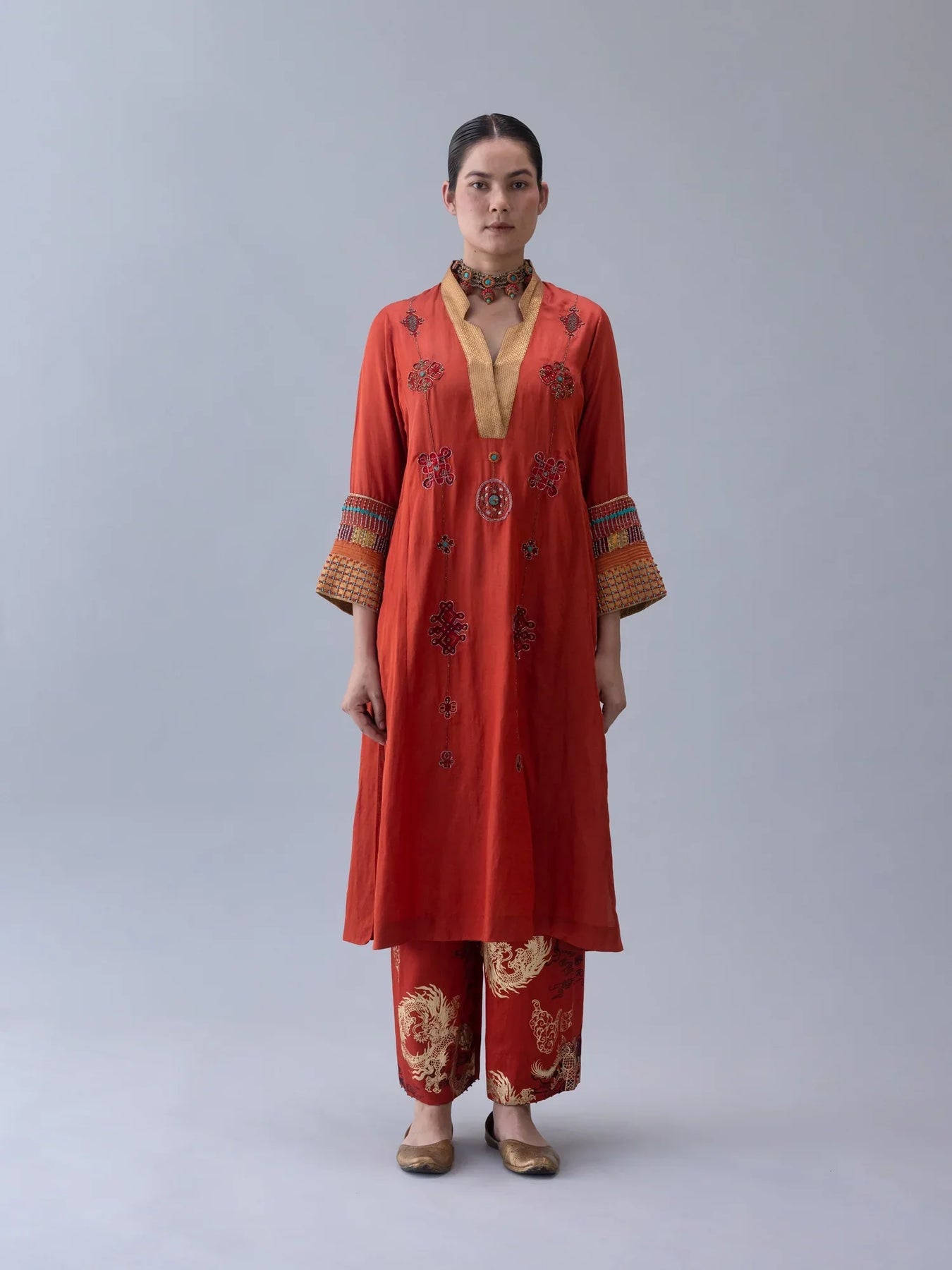 Jakar kurta in dusty orange silk cotton satin presents a refined A-line silhouette, detailed with nakshi, dabka, and zari motifs. Full sleeves with adda cuffs and deep red facing add structure. Country of origin: India