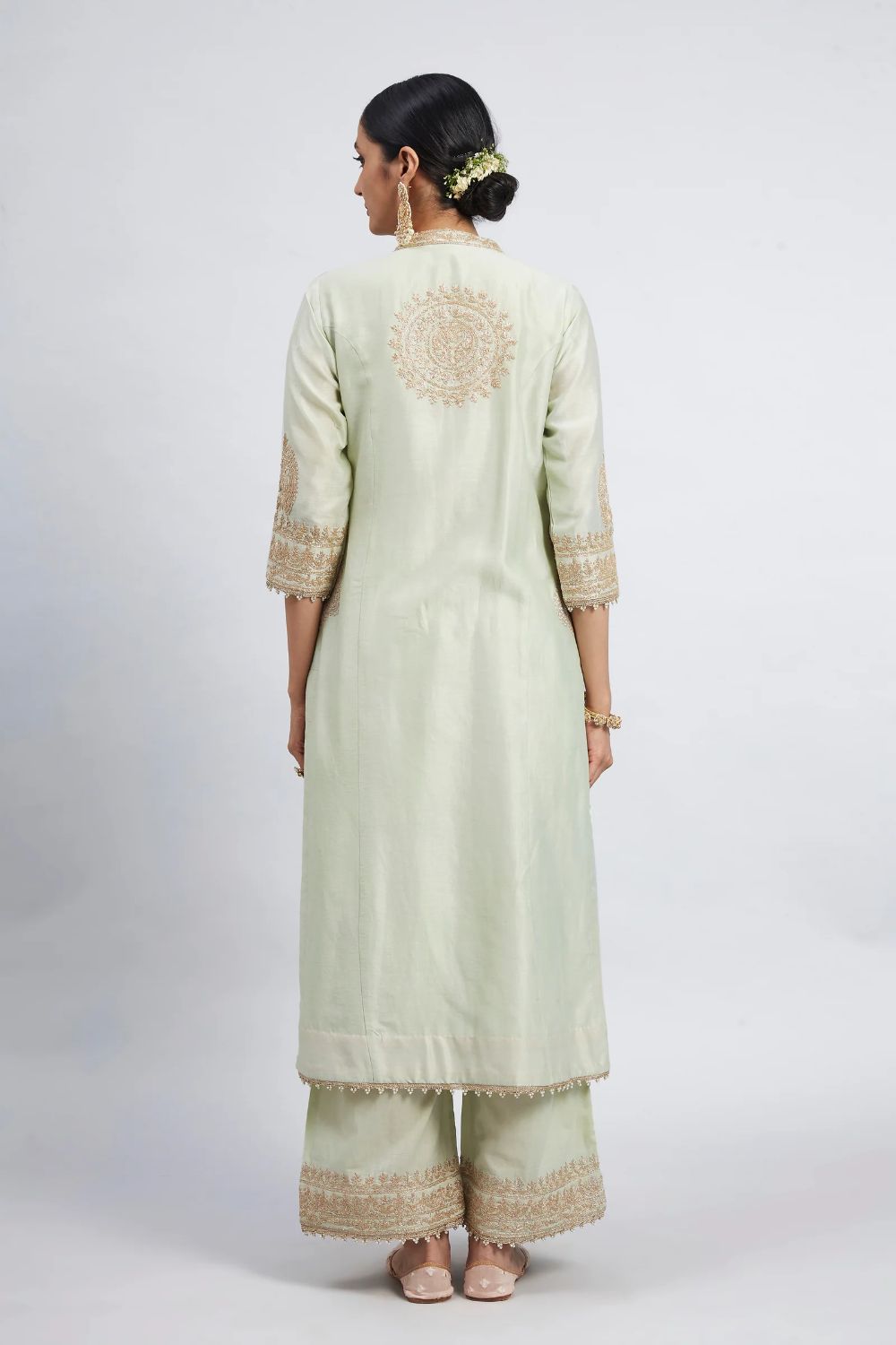 The Aadah ensemble from our Firozah collection is made using a pure Chanderi Silk fabric and is adorned with heritage Kashmiri Tilla embroidery. It features a Mandarin collar with a placket, three-quarter sleeves and side pockets. The look comes together with a straight palazzo. The outfit is finished using an exclusive Chanderi Silk Banarsi fabric and Pearls.
