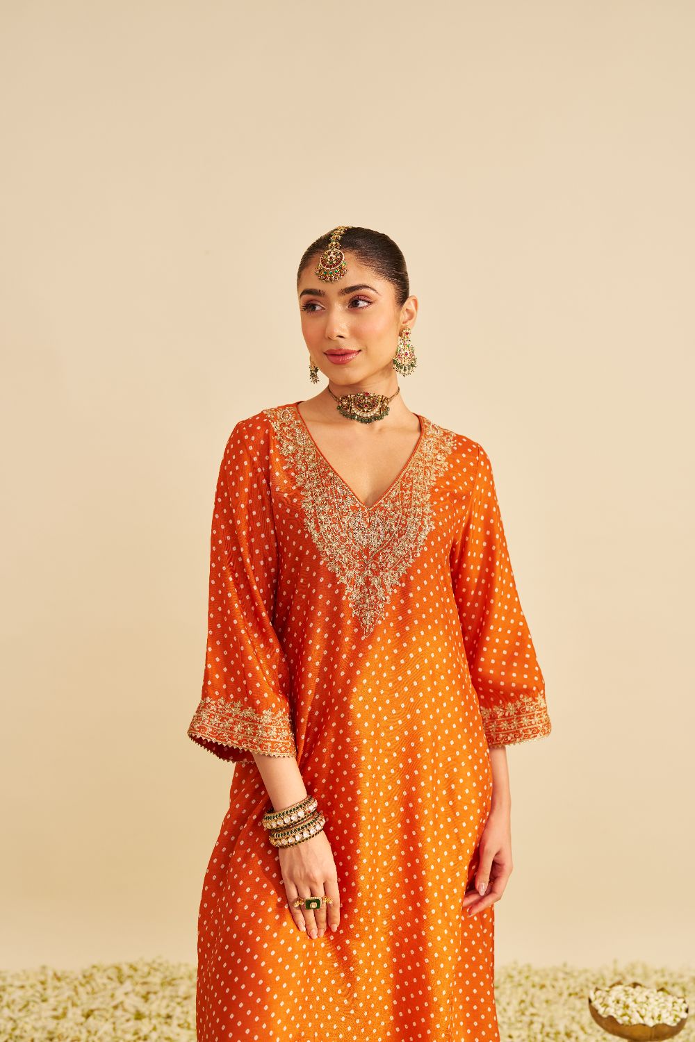 Paired with a traditional Dogri salwar, the ensemble is completed with contrasting Banarasi fabric and gota accents, enhancing its festive and sophisticated appeal.
