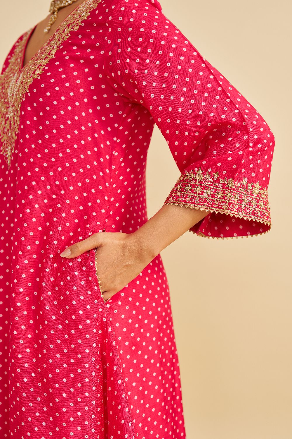 Paired with a traditional Dogri salwar, the ensemble is completed with contrasting Banarasi fabric and gota accents, enhancing its festive and sophisticated appeal.