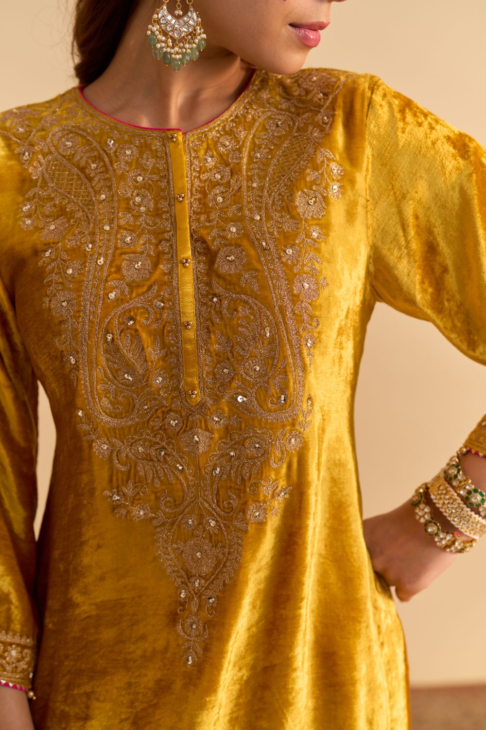 This short kurta from our Velvet Collection features a zero neck, a back zero neck, and three-quarter sleeves. It is paired with an embroidered sharara, adding a contemporary yet traditional touch to the ensemble. The kurta is adorned with intricate aari tilla embroidery, beautifully highlighted with pearls and sequins to enhance its richness and festive charm.