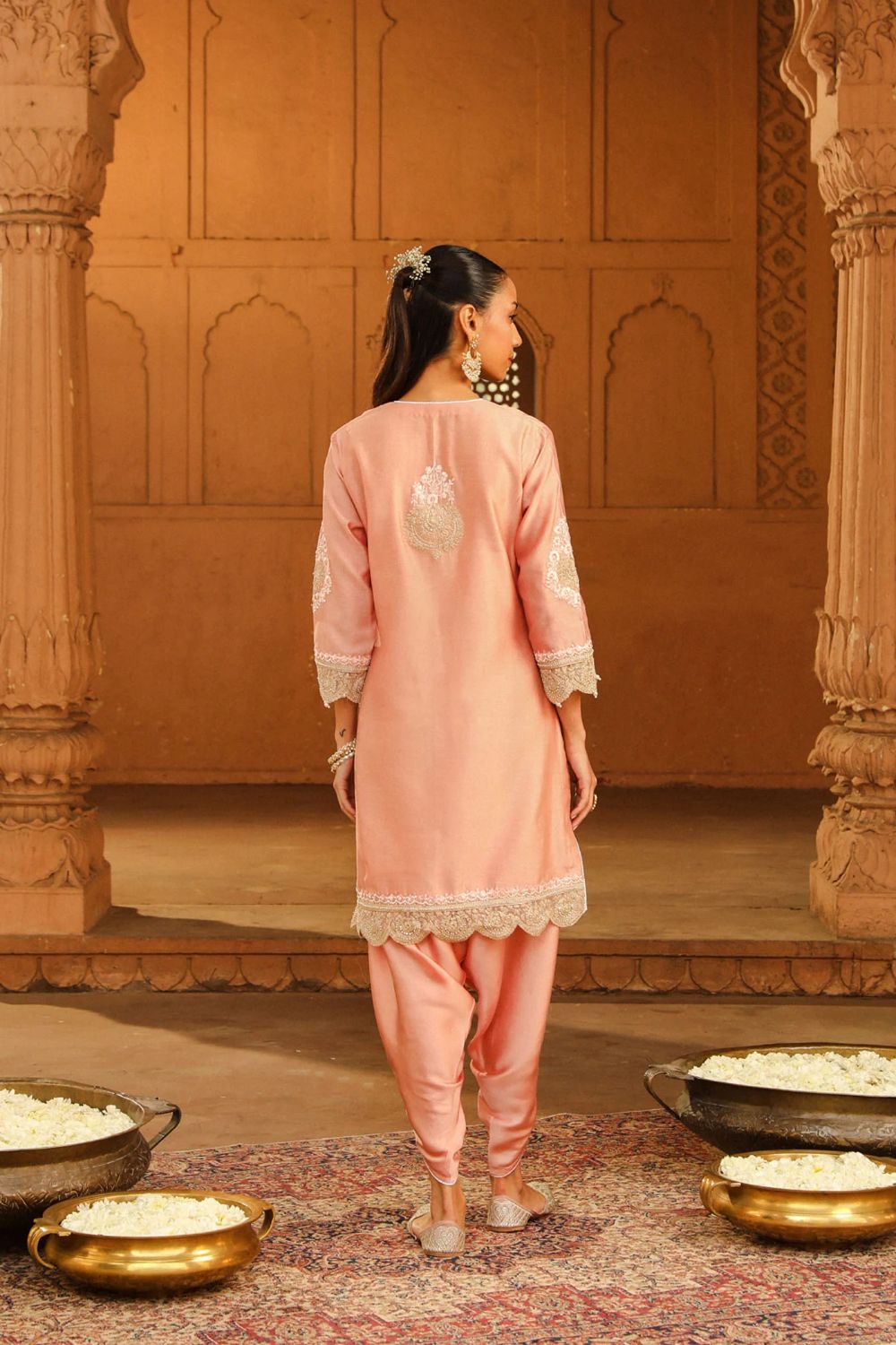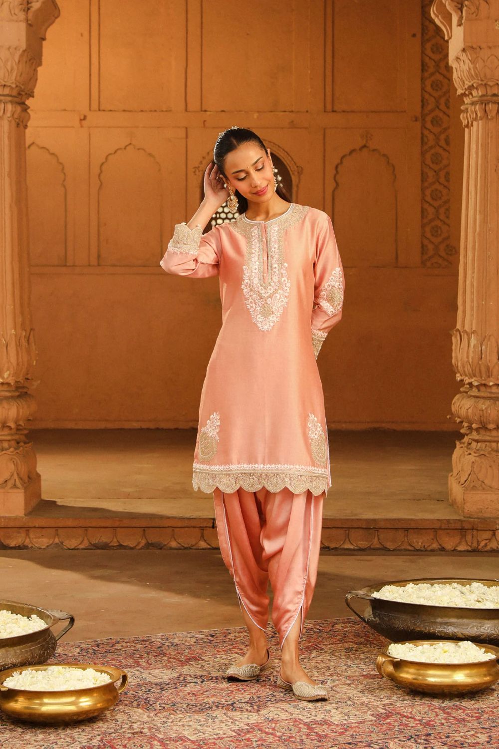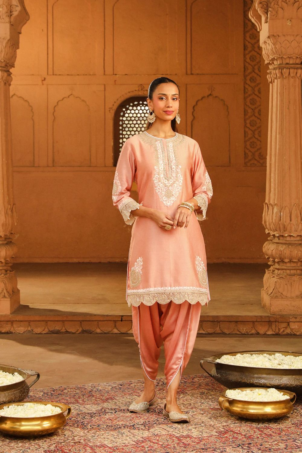 The Ernika short kurta with salwar from our Mehnoor Collection is made in silk chanderi with a dhoti. The kurta is having a zero neck with slit and three-quarter sleeves. The kurta is adorned with Kashmiri tilla and parsi gara embroidery highlighted with basra moti. The sleeves of the kurta is a having an organza detailing. The outfit is finished with scallop detailing.