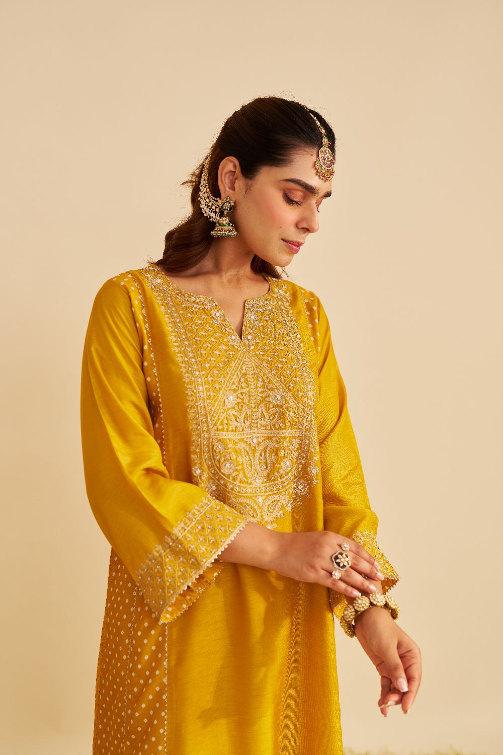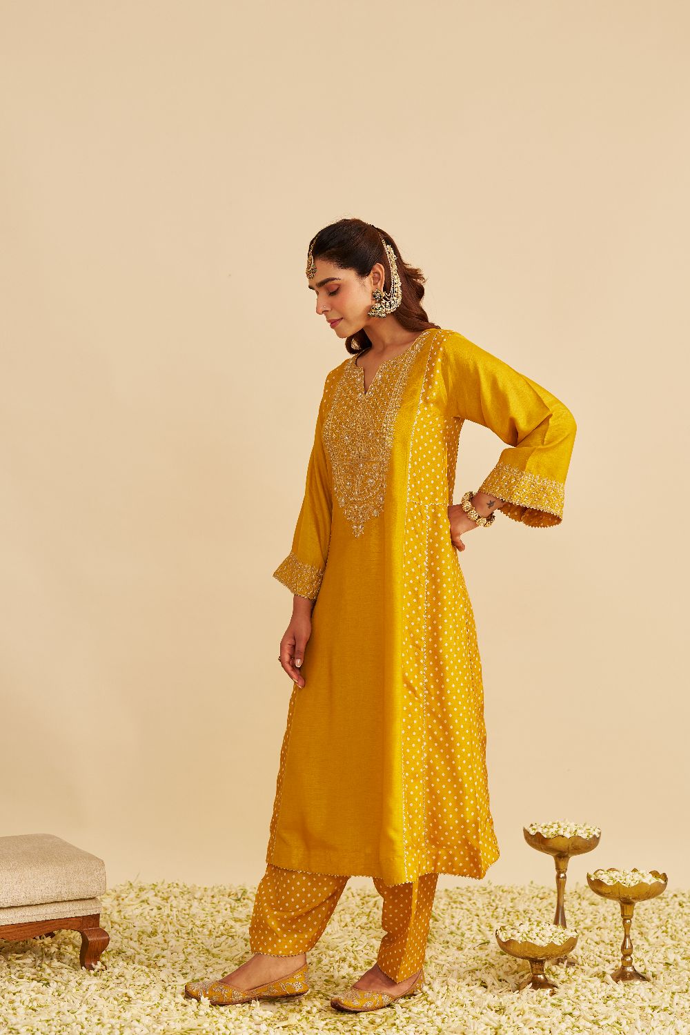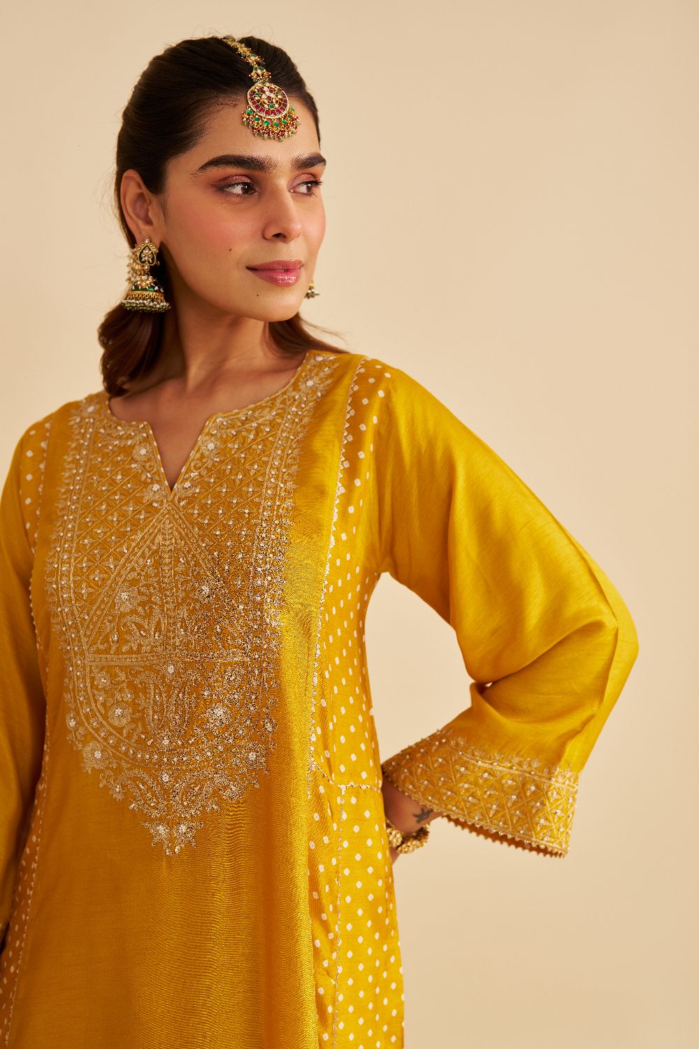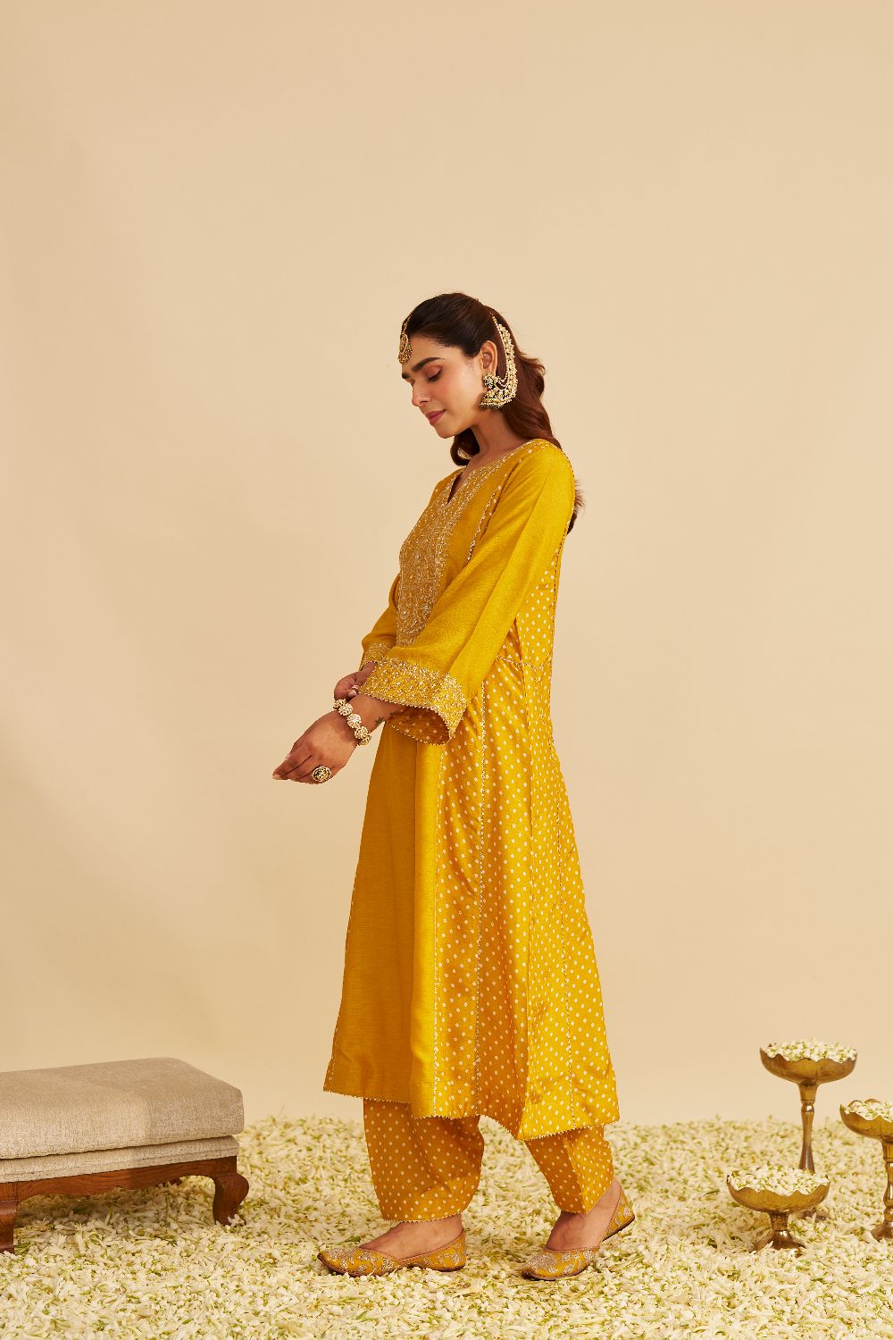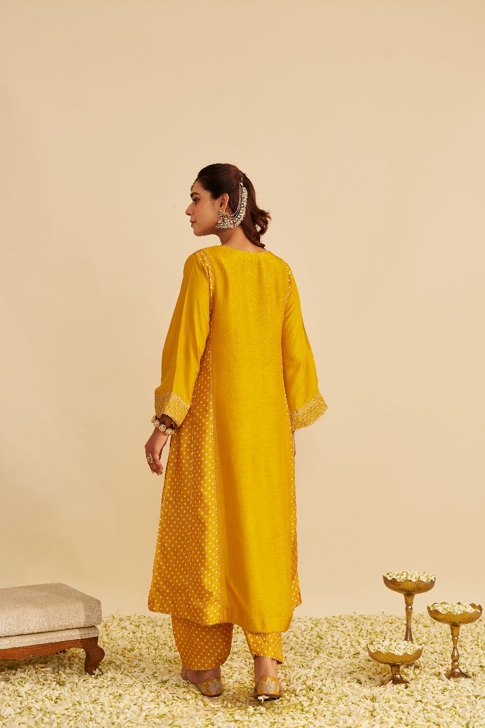 Paired with a traditional Dogri salwar, the ensemble is finished with Bandhej and gota detailing, blending artisanal charm with sophisticated style.