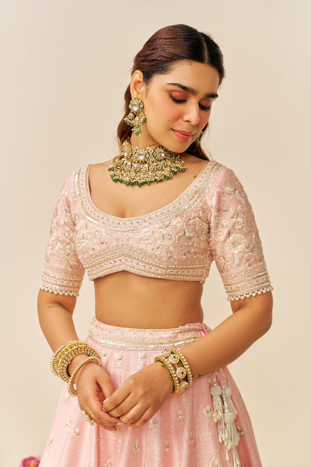 The lehenga is finished with delicate scallop detailing, adding a refined touch to the overall look. Every element of this ensemble, from the embroidery to the pearl embellishments, exudes luxury and timeless elegance, making it a perfect choice for special occasions.