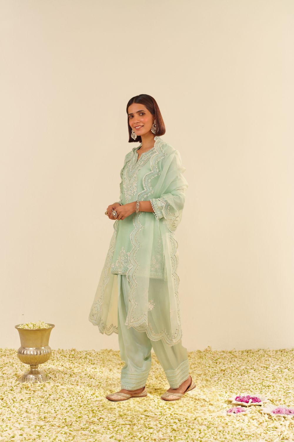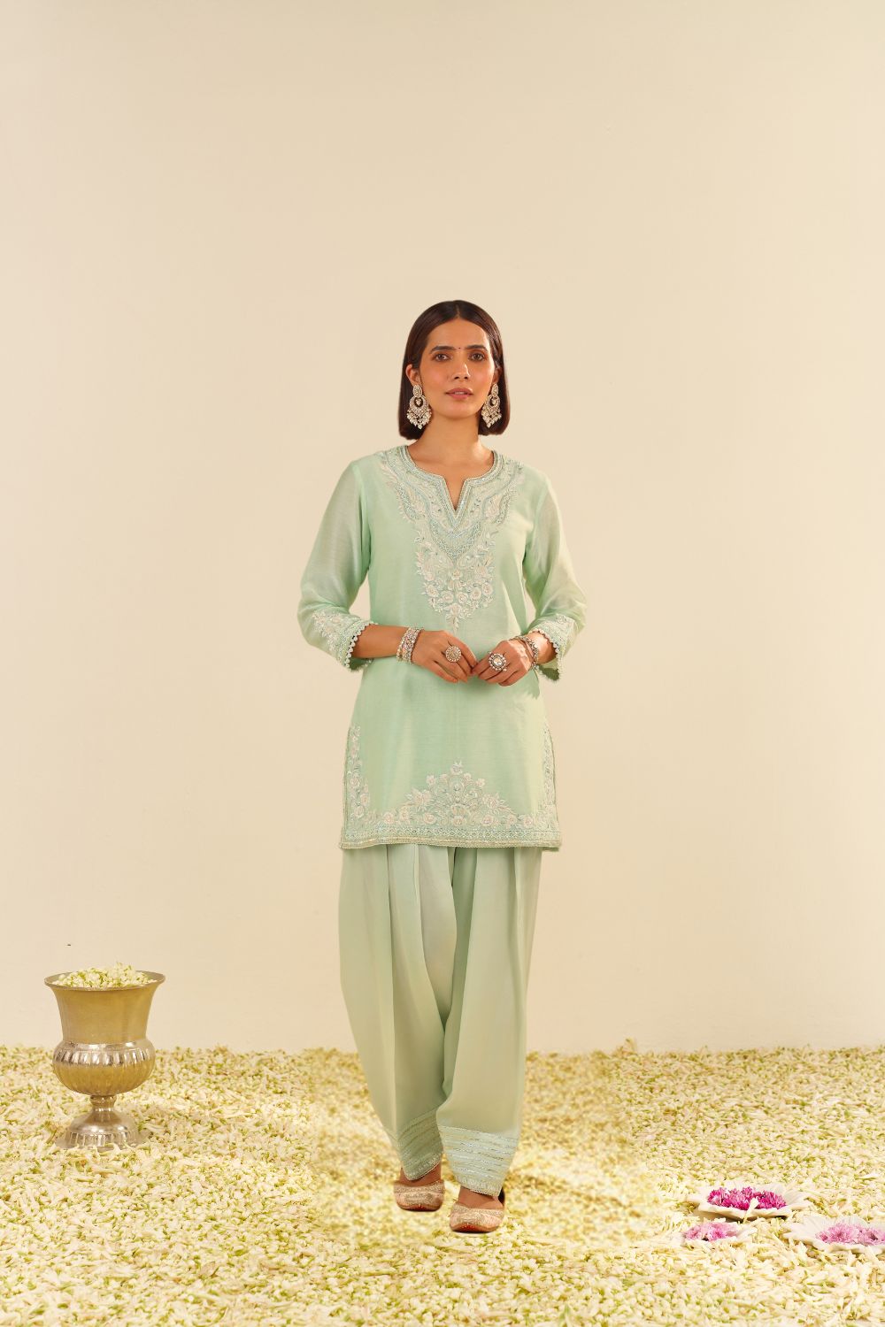 Each garment carries her signature balance — delicate motifs, fluid silhouettes, and a fit that feels custom even before tailoring begins. Her embroideries are intricate yet airy, expressive yet elegantly understated.