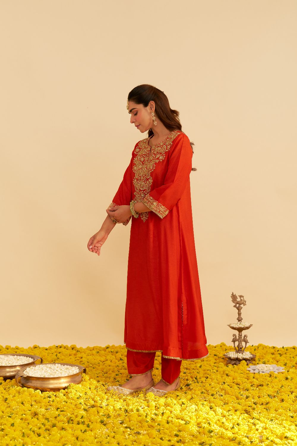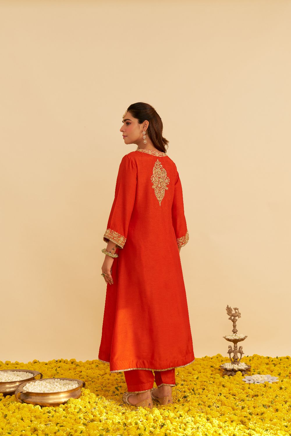 The long kaftan features a zero neckline with a front slit, a zero back, and three-quarter sleeves finished with traditional Kiran detailing. It is paired with a classic Dogri salwar, completing the ensemble with a touch of timeless charm.