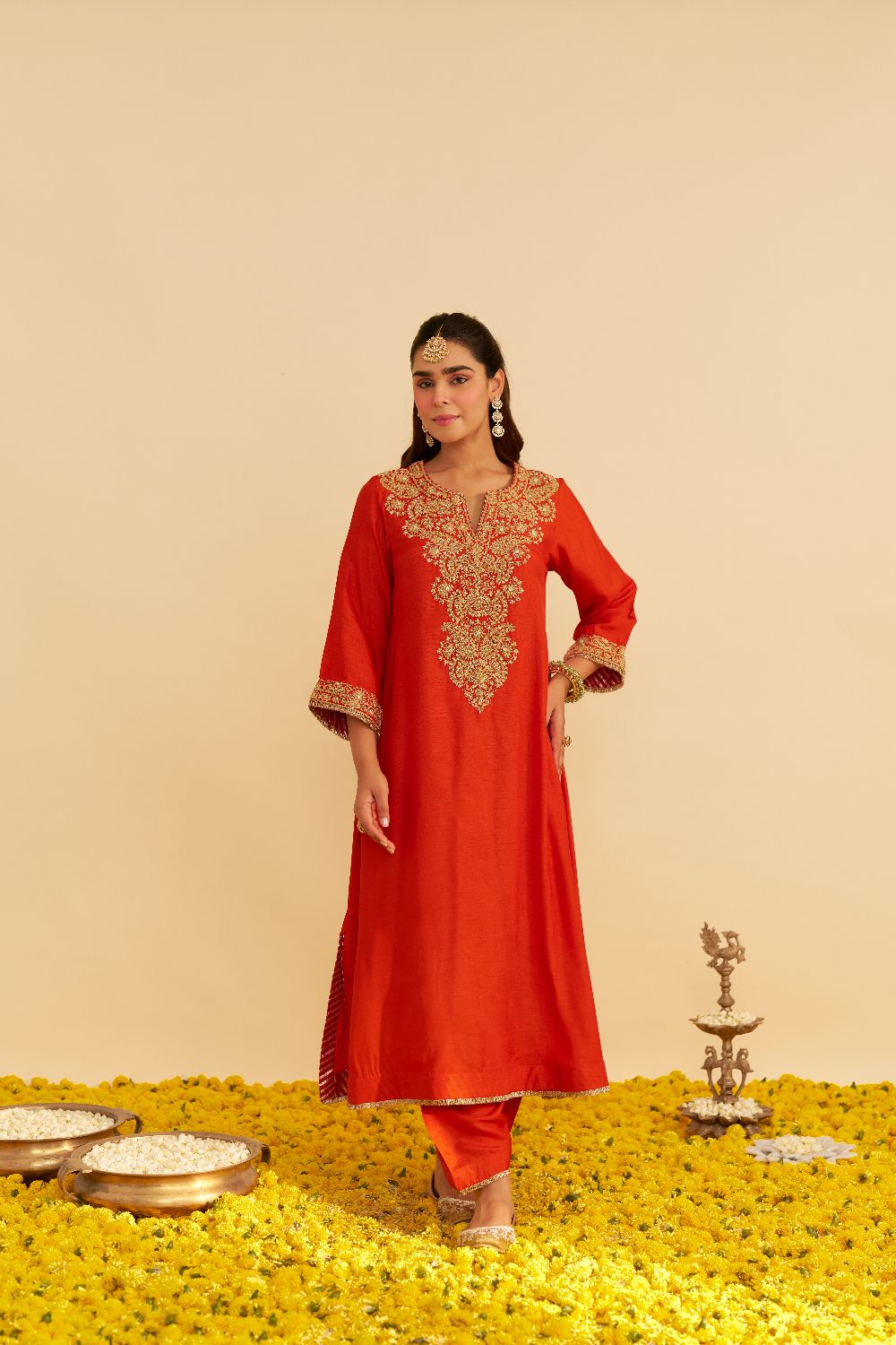 The entire outfit is beautifully finished with contrasting Banarasi fabric and gota accents, enhancing its festive and regal appeal.