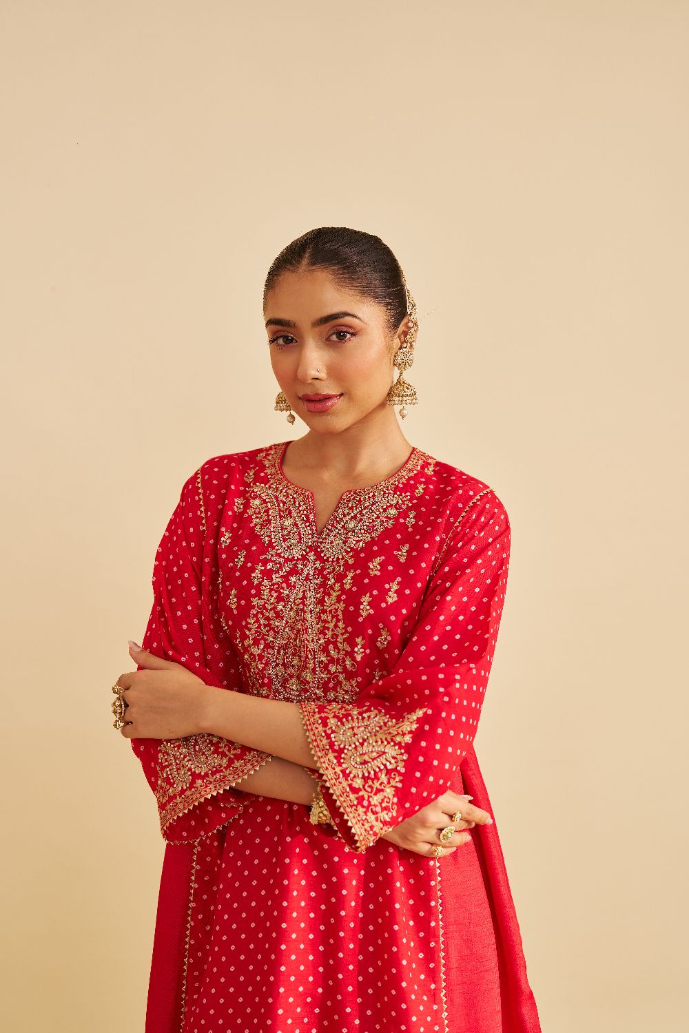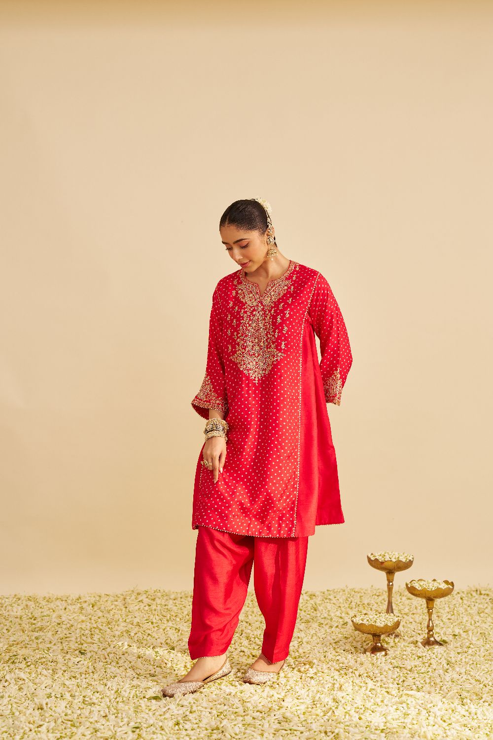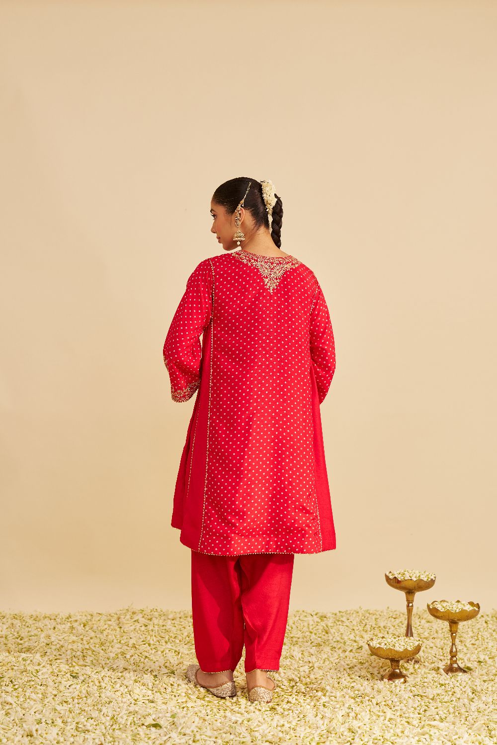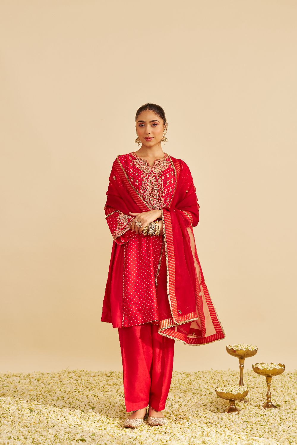 Finished with Bandhej accents and delicate gota detailing, this set is a celebration of rich textile heritage and refined craftsmanship.