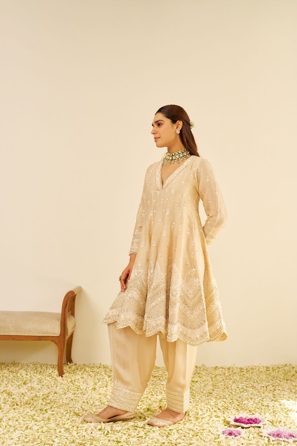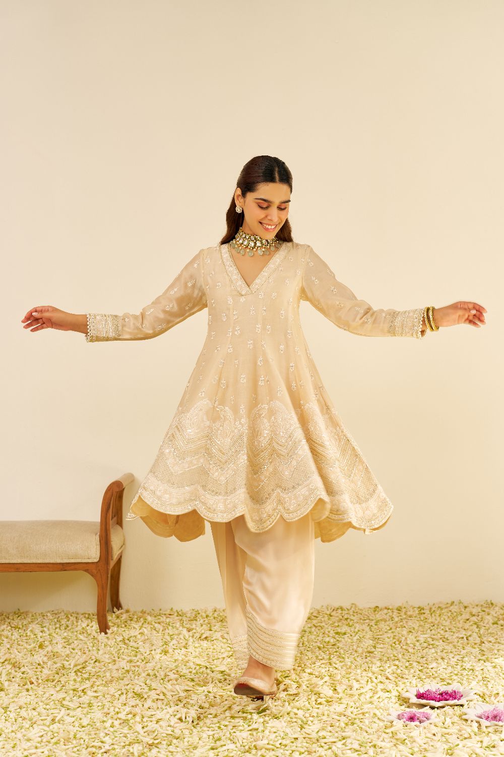 Adorned with intricate Parsi Gara embroidery, the ensemble is further highlighted with shimmering Tilla, Gota, and Basra Moti embellishments, adding depth and opulence to the design. The sleeves of the kurta are finished with detailed pearls, providing a refined and elegant touch. To complete the look, the outfit is beautifully finished with scallop detailing, enhancing its overall sophistication and making it a truly exquisite creation.