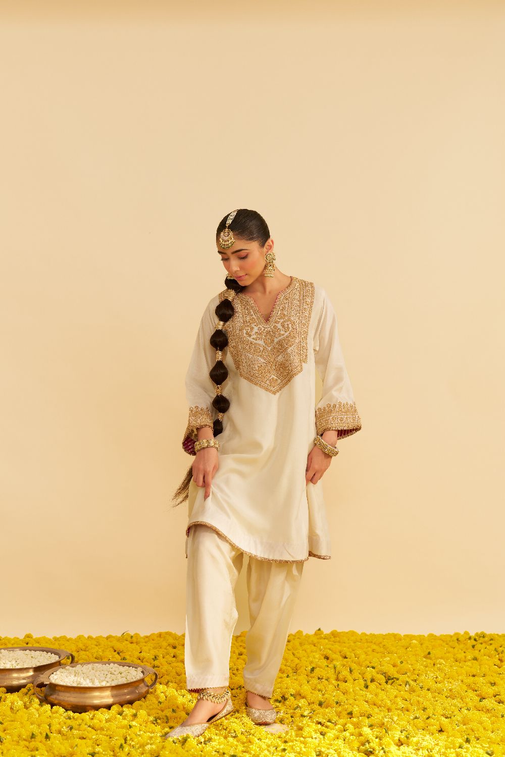 It features a zero neckline with a slit, and three-quarter bell sleeves finished with classic Kiran detailing. Paired with a traditional Dogri salwar, the outfit is completed with a contrasting Banarasi fabric, enhancing its overall opulence and timeless appeal.