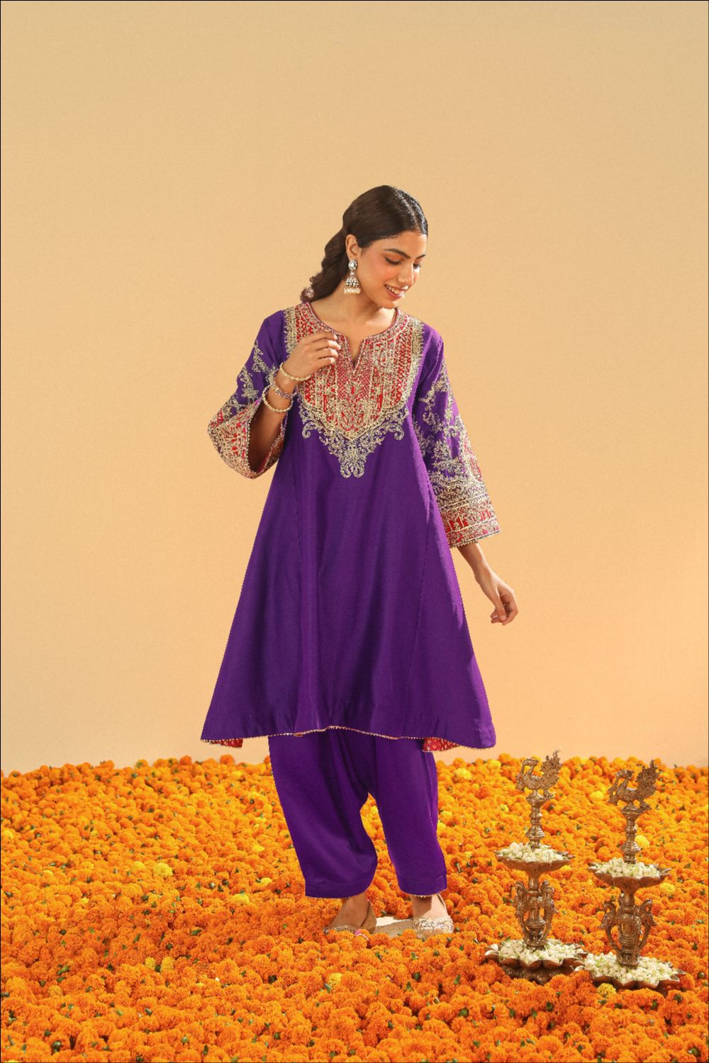 This ensemble is made in pure silk chanderi fabric and adorned with heritage Kashmiri Tilla Embroidery. It features a zero neck with slit and three-quarter bell sleeves. The whole ensemble is highlighted with appliqué, gota and is finished using a chanderi silk banarsi fabric.