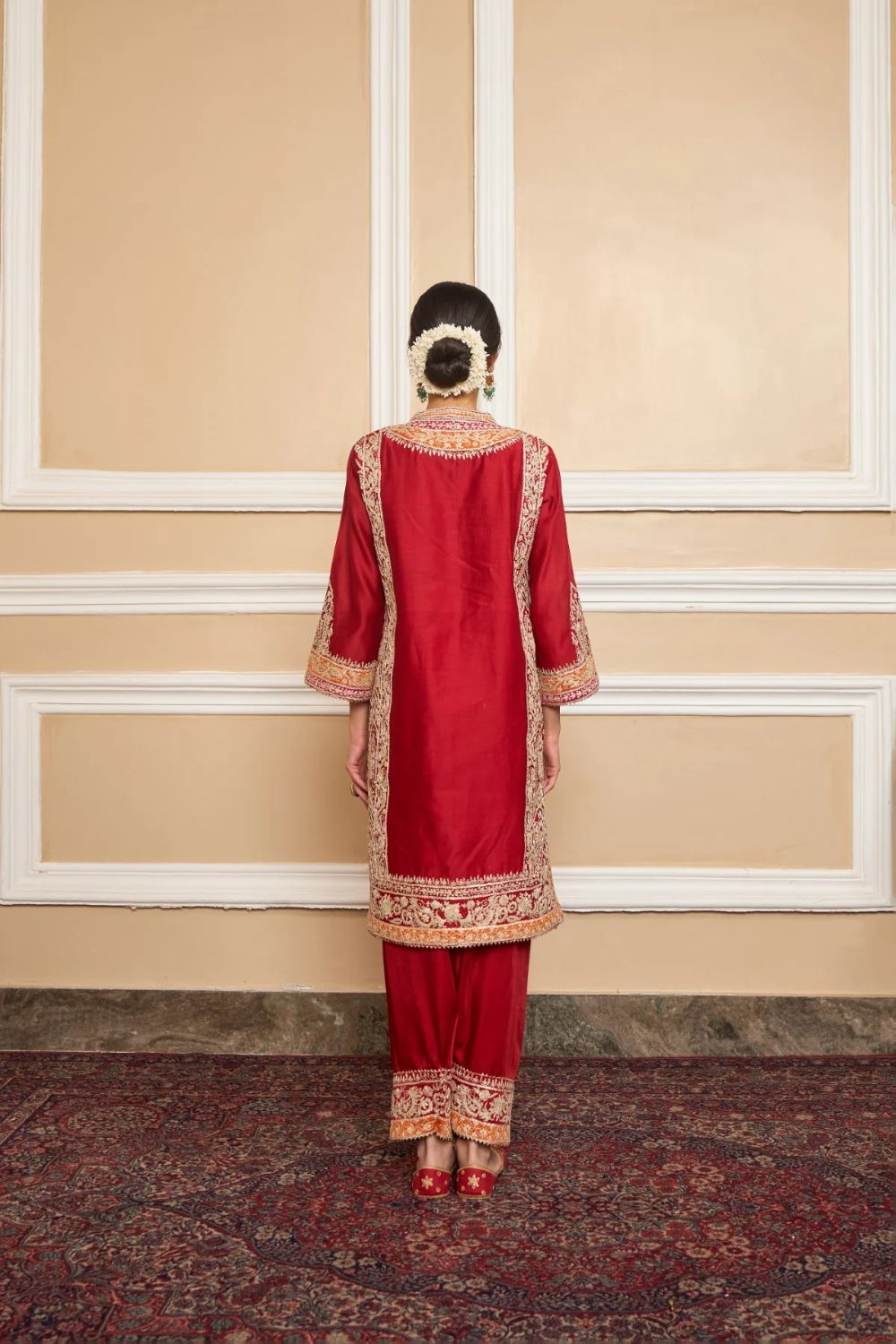 This ensemble is made in pure silk chanderi fabric and adorned with heritage Kashmiri Tilla Embroidery. It features a collar with placket, three-quarter bell sleeves. The salwar will have an embroidery border at hem. The whole ensemble is highlighted with appliqué, gota and is finished using a chanderi silk banarsi fabric and gota. The dupatta is finished is finished with kinari.