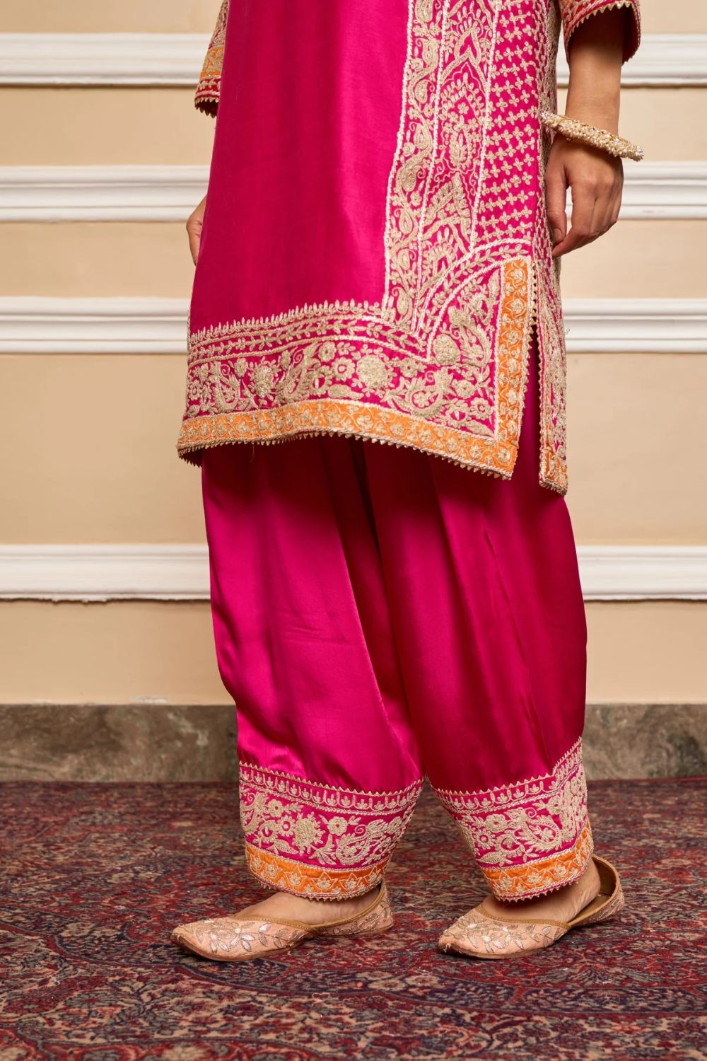 This ensemble is made in pure silk chanderi fabric and adorned with heritage Kashmiri Tilla Embroidery. It features a collar with placket, three-quarter bell sleeves. The salwar will have an embroidery border at hem. The whole ensemble is highlighted with appliqué, gota and is finished using a chanderi silk banarsi fabric and gota. The dupatta is finished is finished with kinari.