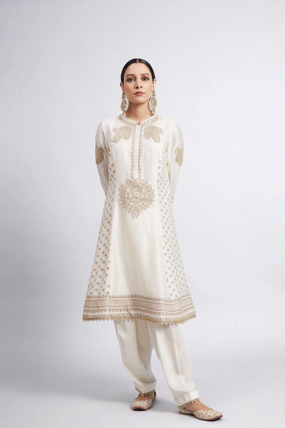 Naazira A-line short kurta with salwar and dupatta-Daisy Ivory