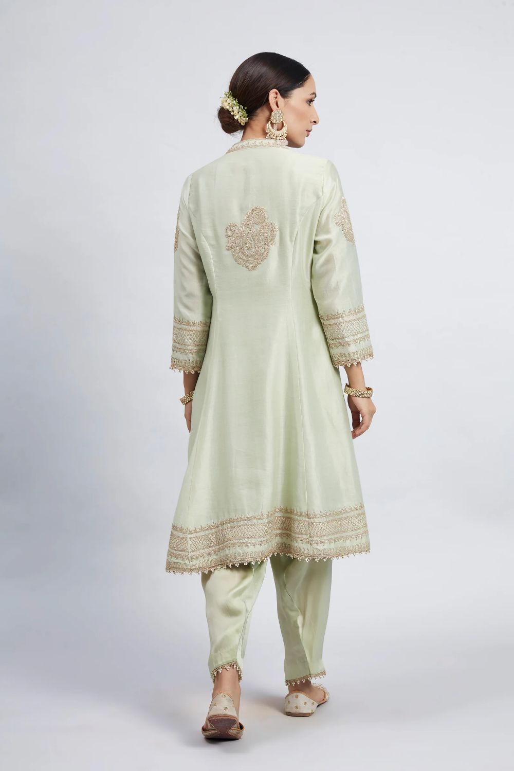 The Naazira ensemble from our Firozah collection adornes a princess-cut with heritage Kashmiri Tilla Embroidery. It features a Mandarin collar with a placket and three-quarter sleeves. The side panels of the kurta are adorned with tiny motifs and the look comes together with salwar and a silk organza dupatta. The outfit is finished using an exclusive Chanderi Silk Banarsi fabric and Pearls.