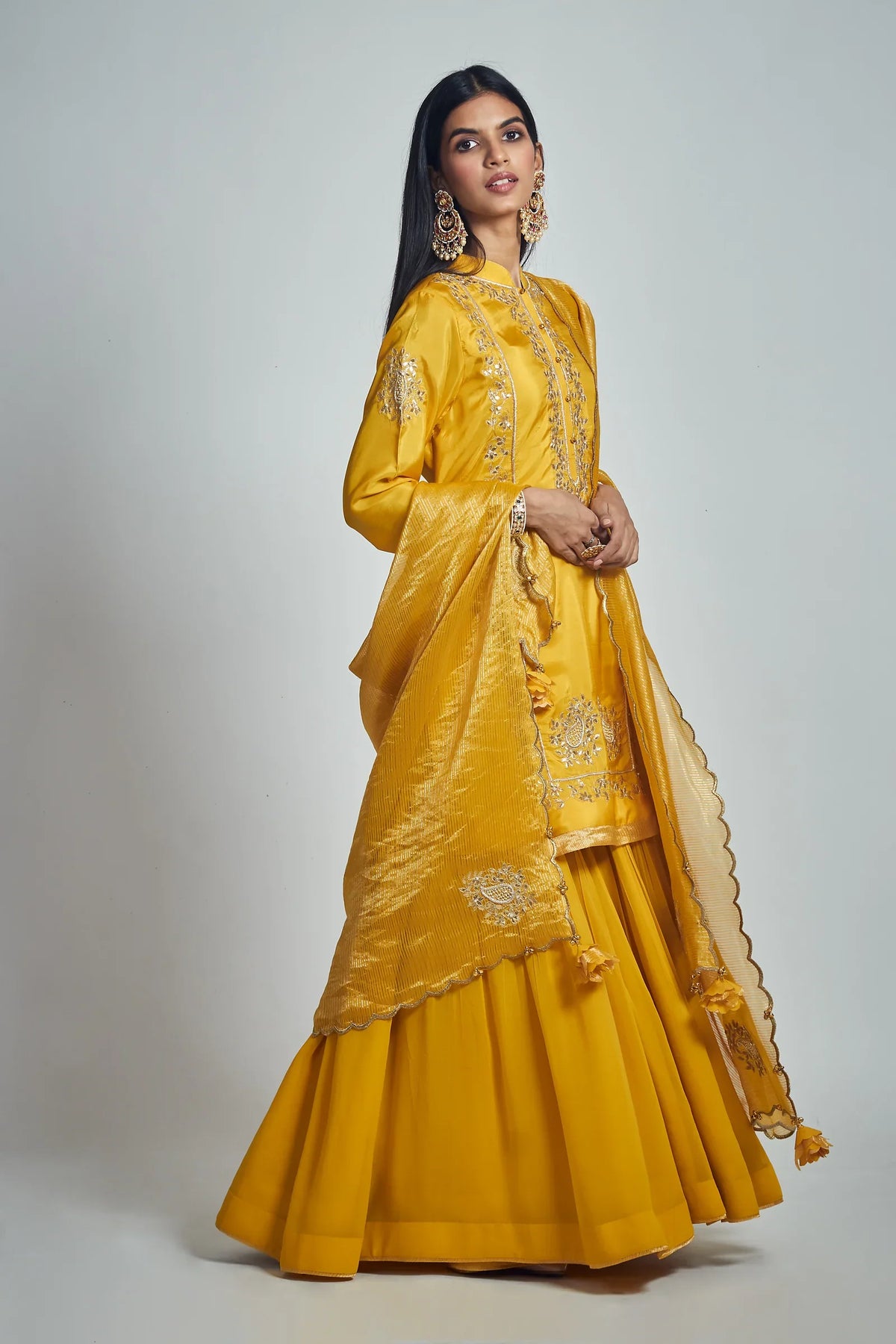 The Nasira ensemble from our Itr collection, made in pure Habutai silk is adorned with heritage gota patti, dabka, kasab and pearl embroidery. It features a mandarin collar with potli button and full sleeves. It comes with a pure georgette and a silk organza tissue dupatta featuring paisley motifs . The finishing of whole outfit is done by silk organza tissue.