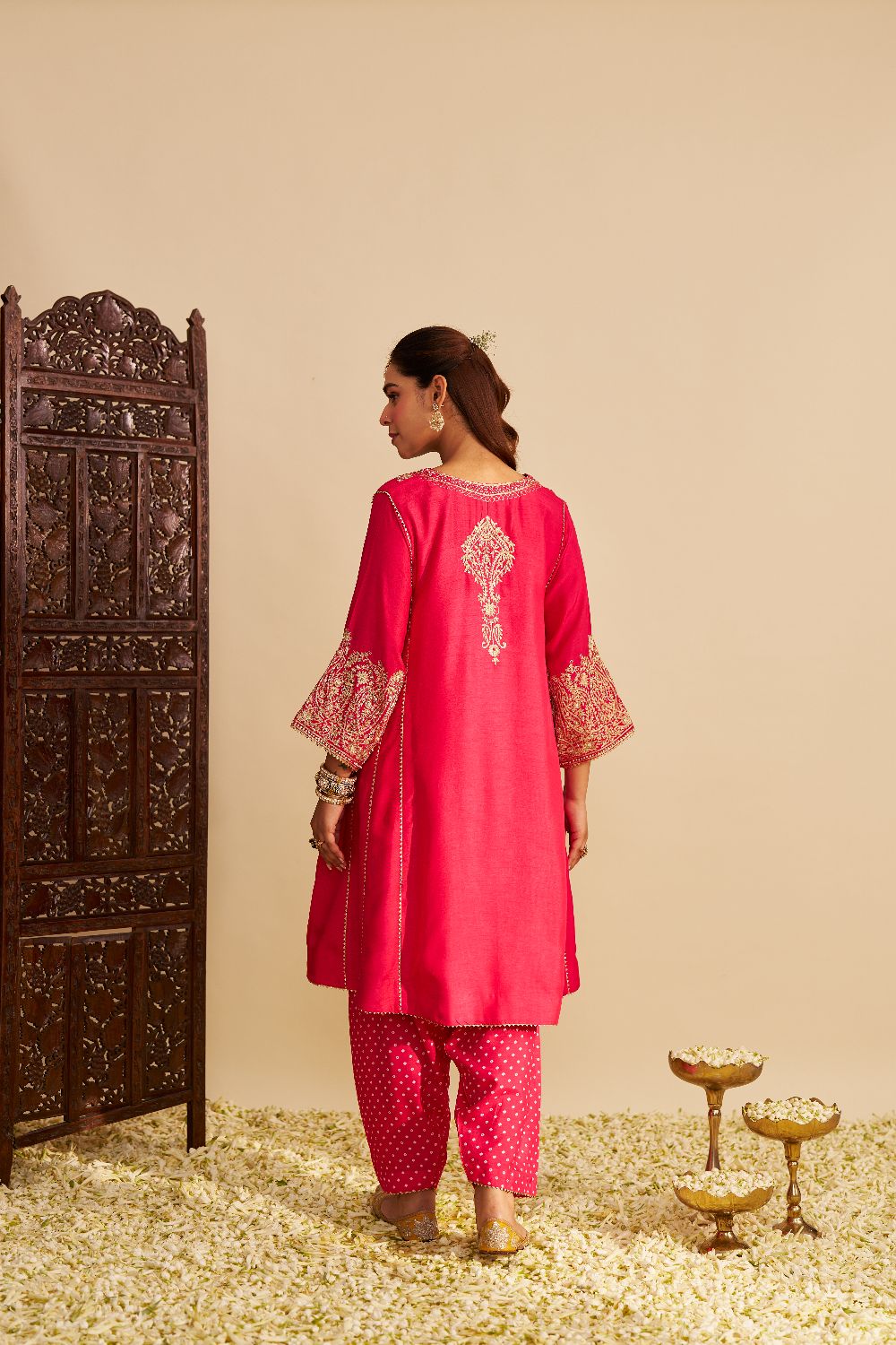 The ensemble is paired with a classic Bandhej Dogri salwar, creating a timeless yet stylish outfit. It is adorned with intricate Aari Tilla embroidery, beautifully highlighted with pearls and sequins for a subtle shimmer.