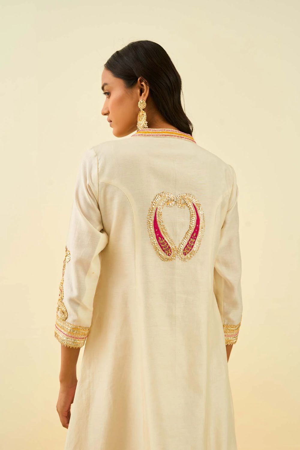 The Sadirah ensemble from the Noor collection is made using a pure Chanderi Silk fabric, crafted with gotapatti and highlighted with basra moti. It features a Mandarin collar with a placket and three-quarter sleeves. The look comes together with a salwar and a silk organza dupatta. The outfit is finished using an exclusive Chanderi Silk Banarsi fabric and Pearls.
