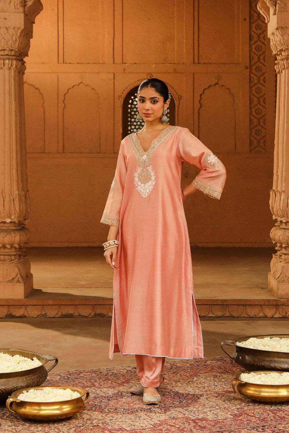 The ensemble is made in pure chanderi silk fabric. The outfit is adorned with Kashmiri tilla and parsi gara embroidery highlighted with basra moti. The long kaaftan is having a broad and deep V neckline at front, a zero back and three-quarter sleeves. The outfit comes with a dogri salwar. The whole outfit is finished with scallop detailing.