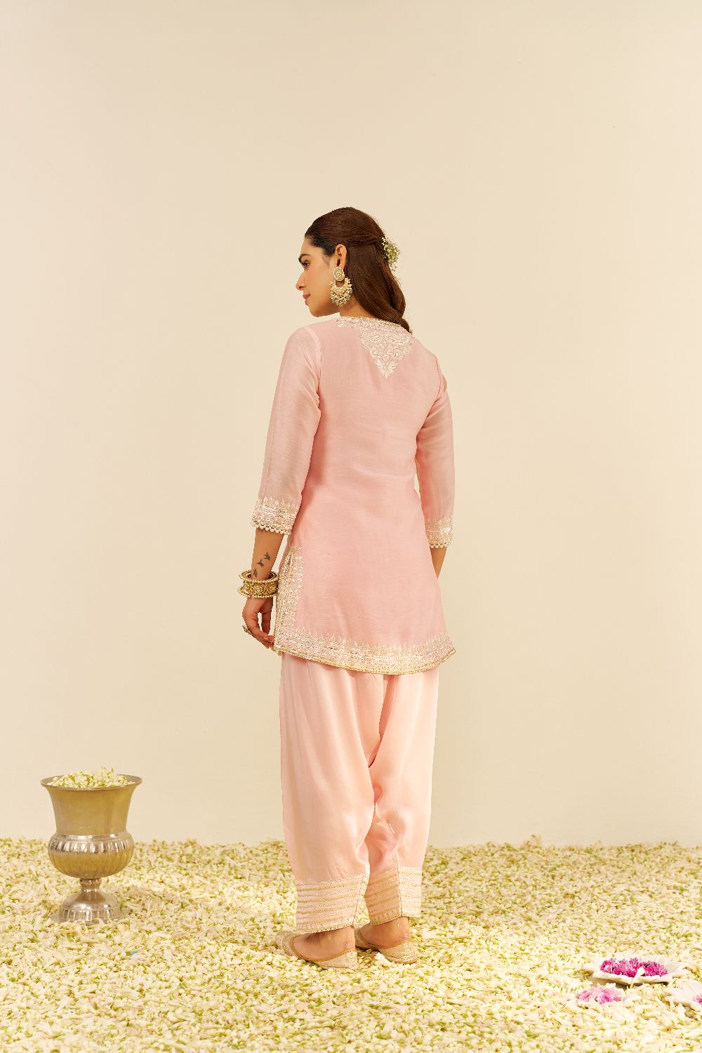 Each garment carries her signature balance — delicate motifs, fluid silhouettes, and a fit that feels custom even before tailoring begins. Her embroideries are intricate yet airy, expressive yet elegantly understated.