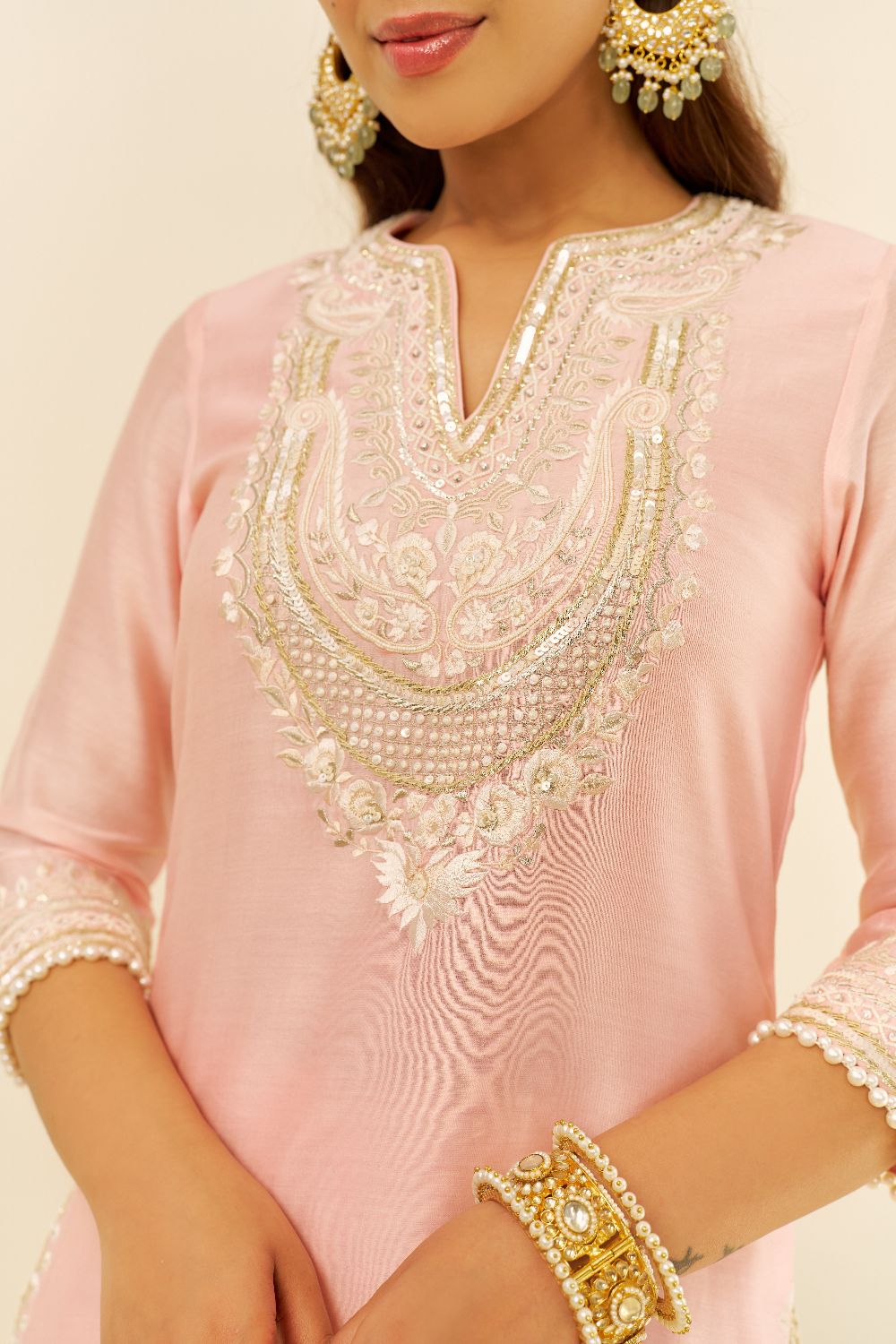 The ensemble is adorned with exquisite Parsi Gara embroidery, intricately highlighted with Tilla, Gota, and pearls, creating a stunning visual appeal. The sleeves of the kurta are elegantly finished with detailed pearls, adding a refined and intricate touch. The entire outfit is beautifully completed with a fine lace and the signature Chanderi silk fabric, offering a polished, luxurious finish that exudes both grace and sophistication.