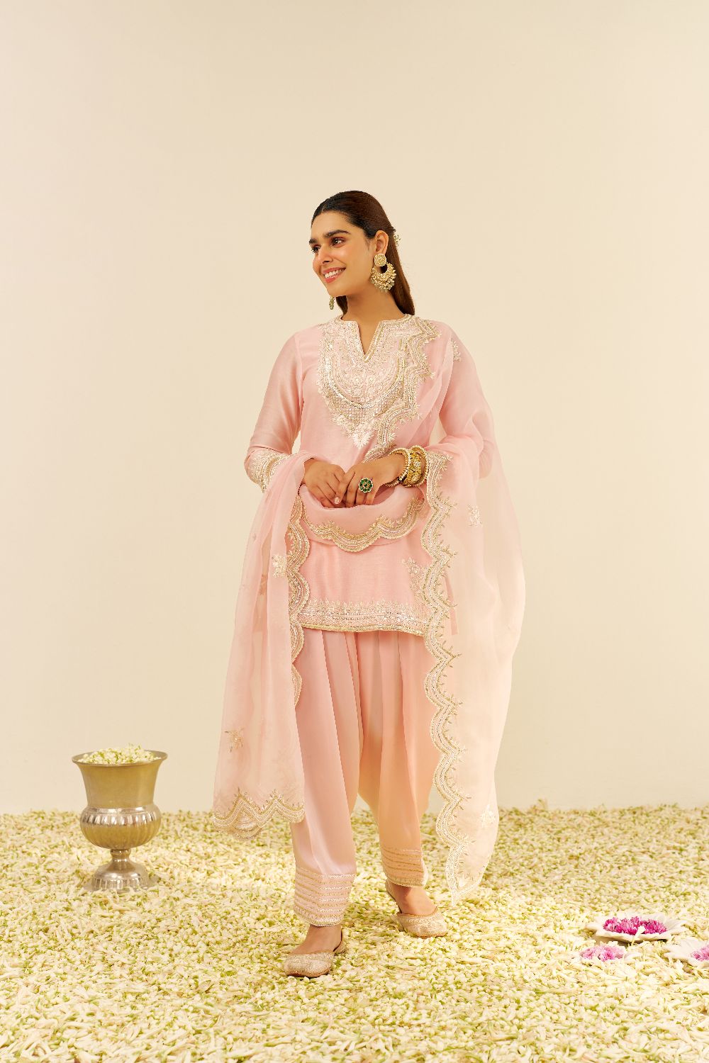 This elegant short A-line Sara ensemble is crafted from pure Silk Chanderi fabric, offering a luxurious and graceful silhouette. It is beautifully teamed with a traditional Dogri salwar and a delicate Silk Organza dupatta, adding a soft and ethereal touch to the look. The outfit features a sophisticated zero-neck design with a slit and three-quarter sleeves, combining modern elements with timeless elegance.