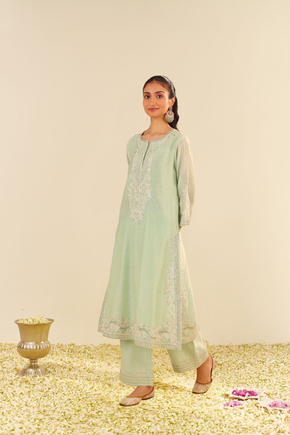 This exquisite long A-line ensemble is crafted from pure Silk Chanderi fabric, offering a luxurious and elegant silhouette. The outfit is paired with a palazzo and a delicate Silk Organza dupatta, adding a soft, ethereal touch to the overall look. It features a sophisticated zero-neck design with a placket and three-quarter sleeves, beautifully merging modern styling with traditional elements. The ensemble is adorned with intricate Parsi Gara embroidery, enhanced with fine Tilla, Gota, and Basra Moti embellishments that add a touch of opulence and texture. The sleeves of the kurta are gracefully finished with detailed pearls, providing a refined, delicate touch. The entire outfit is completed with scallop detailing, adding an elegant finish to the piece, while the dupatta is also adorned with scallop embroidery, perfectly complementing the ensemble. This timeless creation exudes grace, luxury, and exceptional craftsmanship.