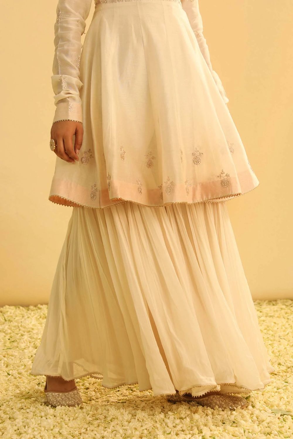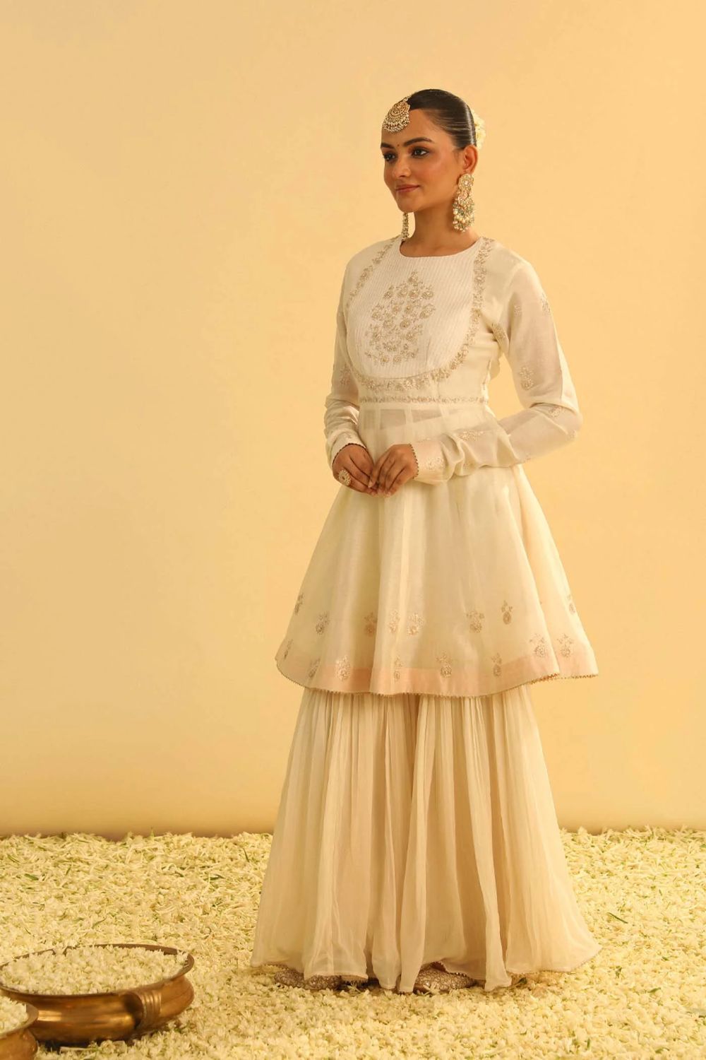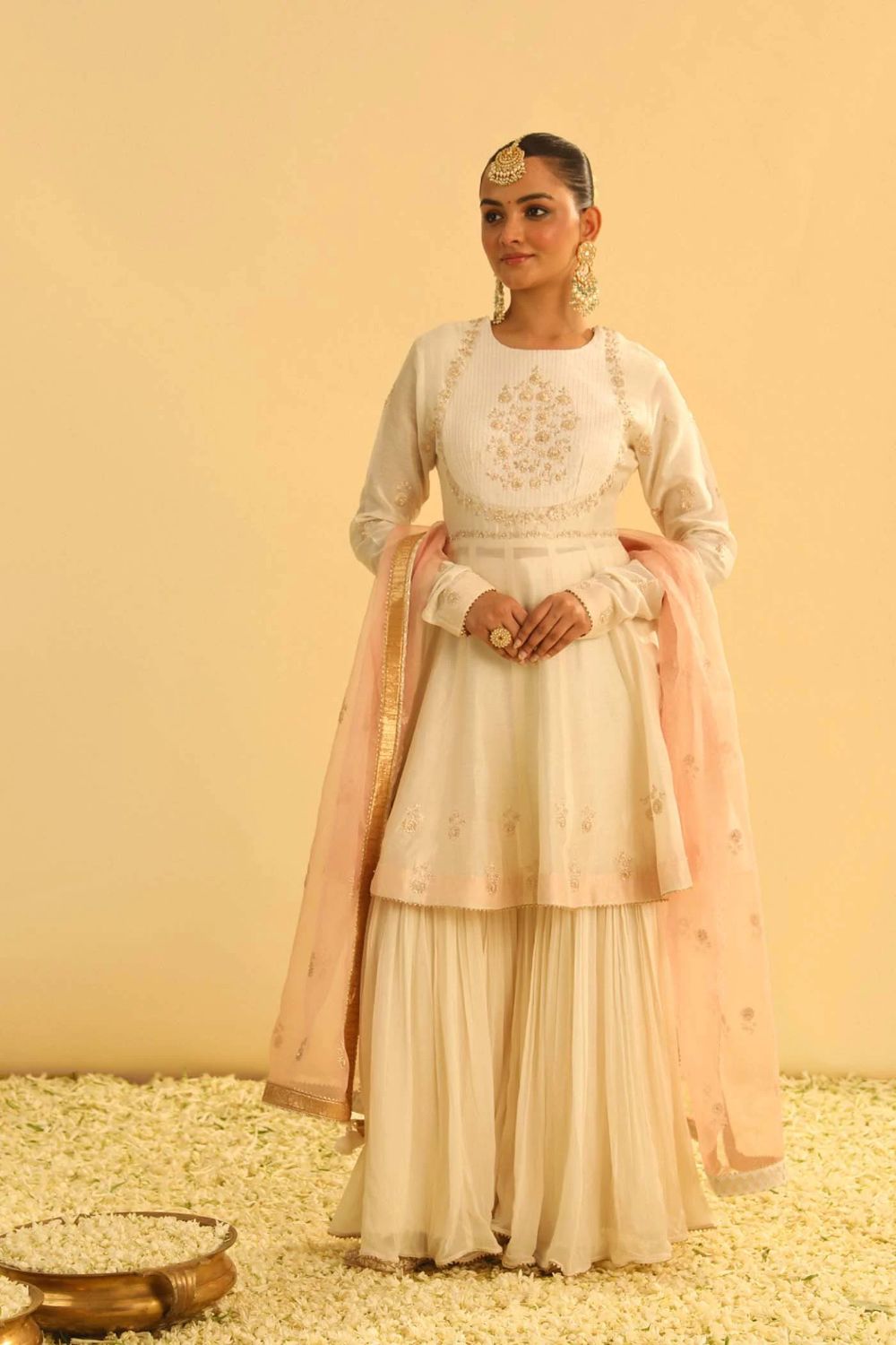 The Shahana emsemble is enhanced with our signature Kashmiri Tilla embroidery. It features a zero neck with chooridaar sleeves. The peplum kurta is teamed up with a crushed garara and the yoke is highlighted with very fine pintucks. The embroidery is highlighted with very fine ivory pearls. The technique is an age-old tradition & one shall cherish it forever. The outfit is finished using a chanderi silk banarsi fabric and gota.