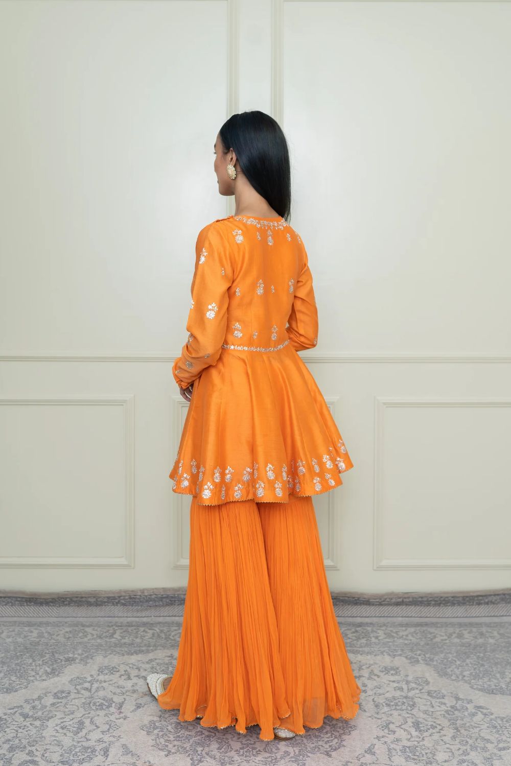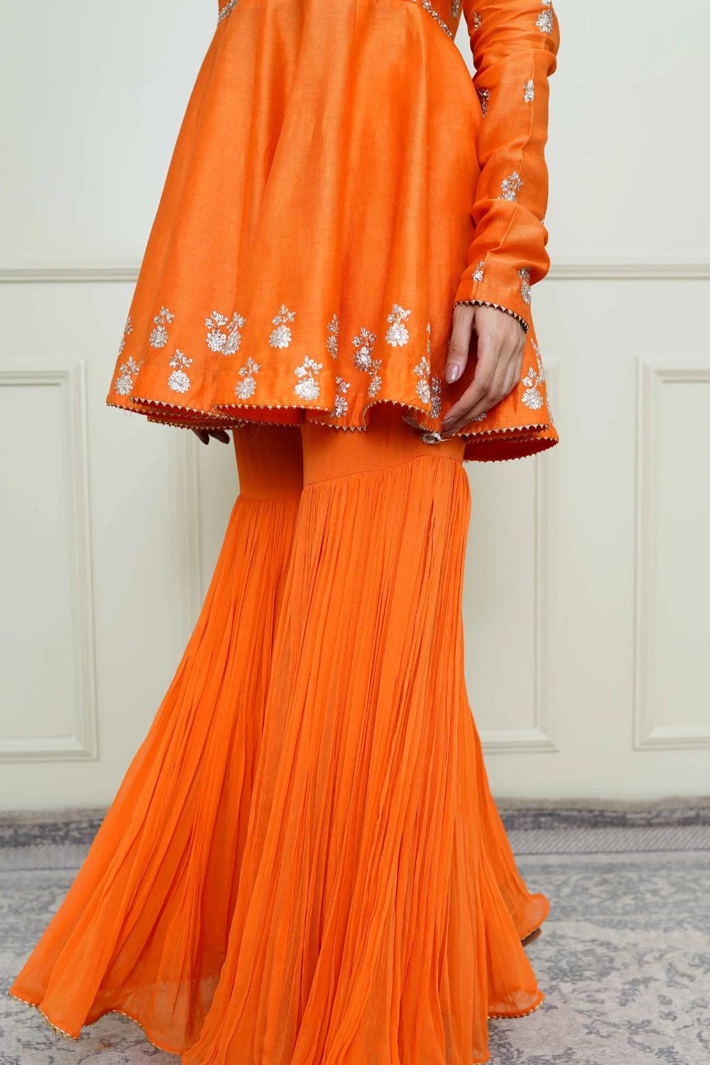 The Shahana emsemble is enhanced with our signature Kashmiri Tilla embroidery. It features a zero neck with chooridaar sleeves. The peplum kurta is teamed up with a crushed garara and the yoke is highlighted with very fine pintucks. The embroidery is highlighted with very fine ivory pearls. The technique is an age-old tradition & one shall cherish it forever. The outfit is finished using a chanderi silk banarsi fabric and gota.