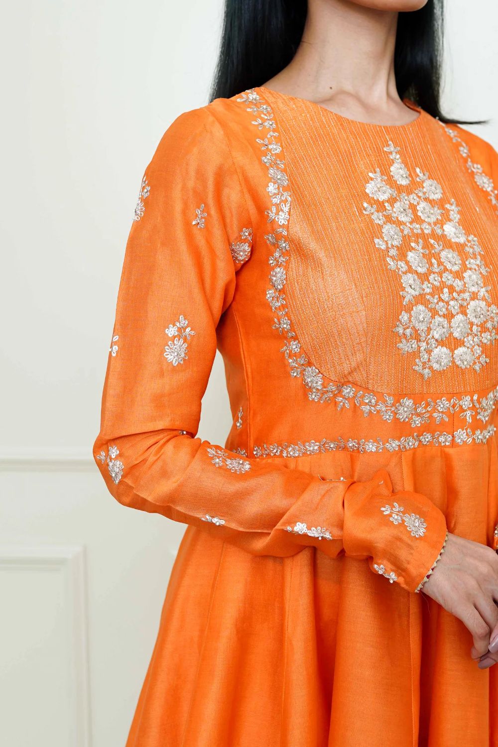 Each garment carries her signature balance — delicate motifs, fluid silhouettes, and a fit that feels custom even before tailoring begins. Her embroideries are intricate yet airy, expressive yet elegantly understated.