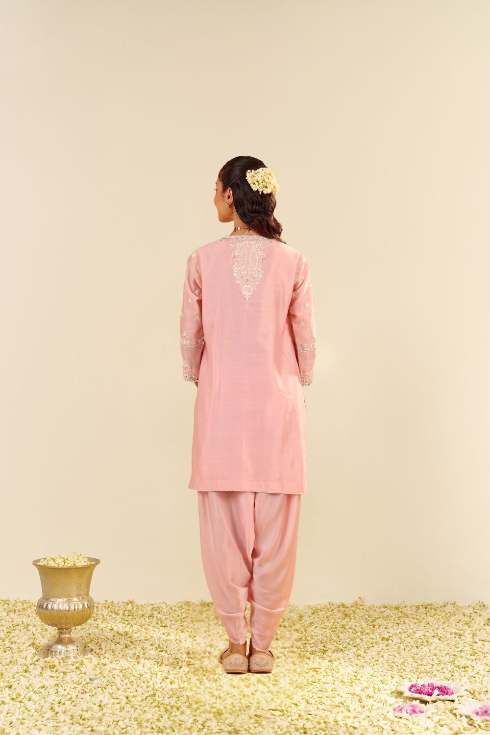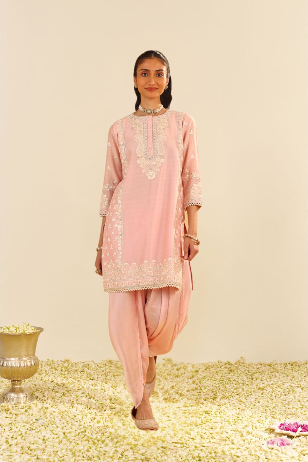 Paired with a stylish tulip dhoti, the ensemble radiates a unique sense of grace and sophistication. The entire creation is beautifully highlighted with delicate Tilla, Gota, and pearls, which enhance the intricate embroidery and elevate the overall look. Finished with the finest Chanderi silk fabric, this ensemble is a perfect fusion of heritage, craftsmanship, and modern style.
