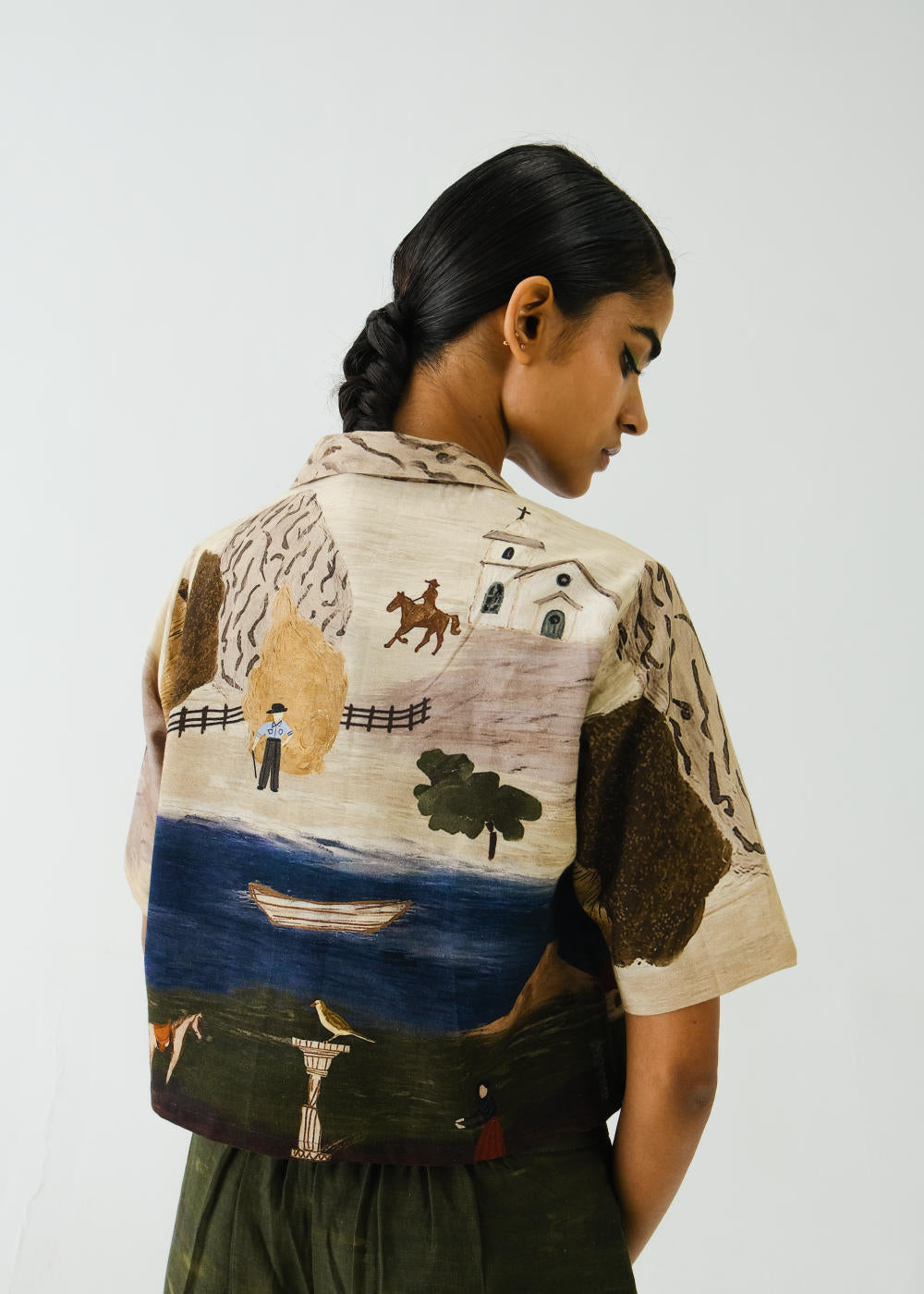 Crafted with meticulous attention to detail, this crop shirt is sure to become your go-to choice this season. Embrace the charm of the Village print. Each stroke tells a story, adding a touch of artisanal flair to your wardrob. Fabric : Linen