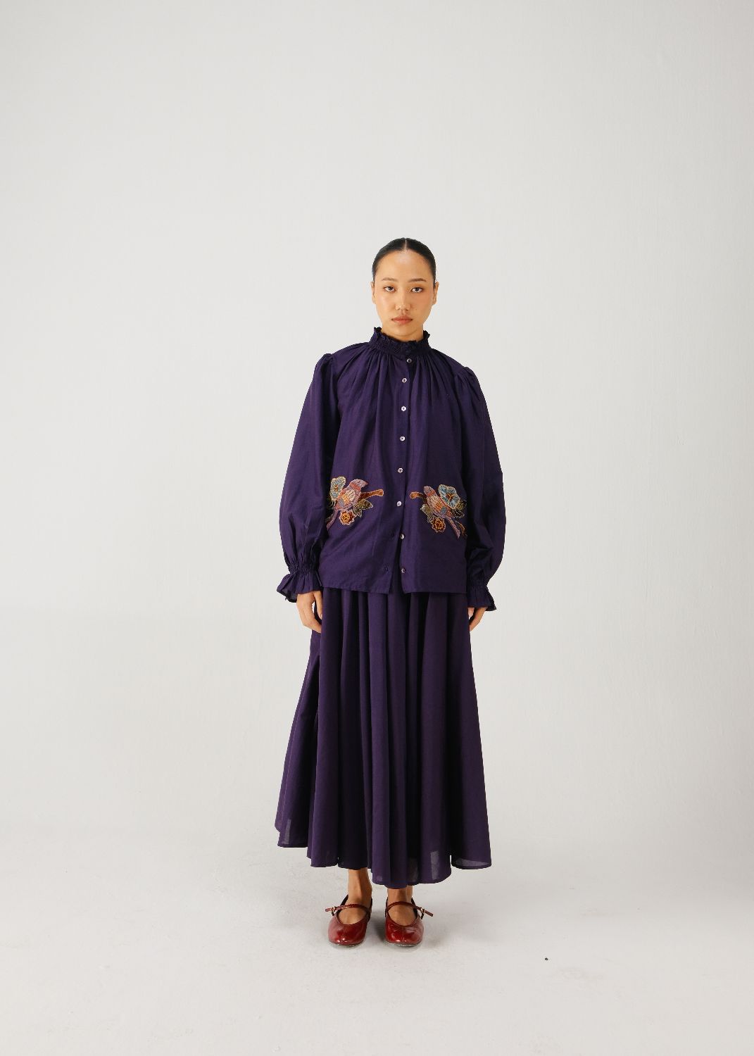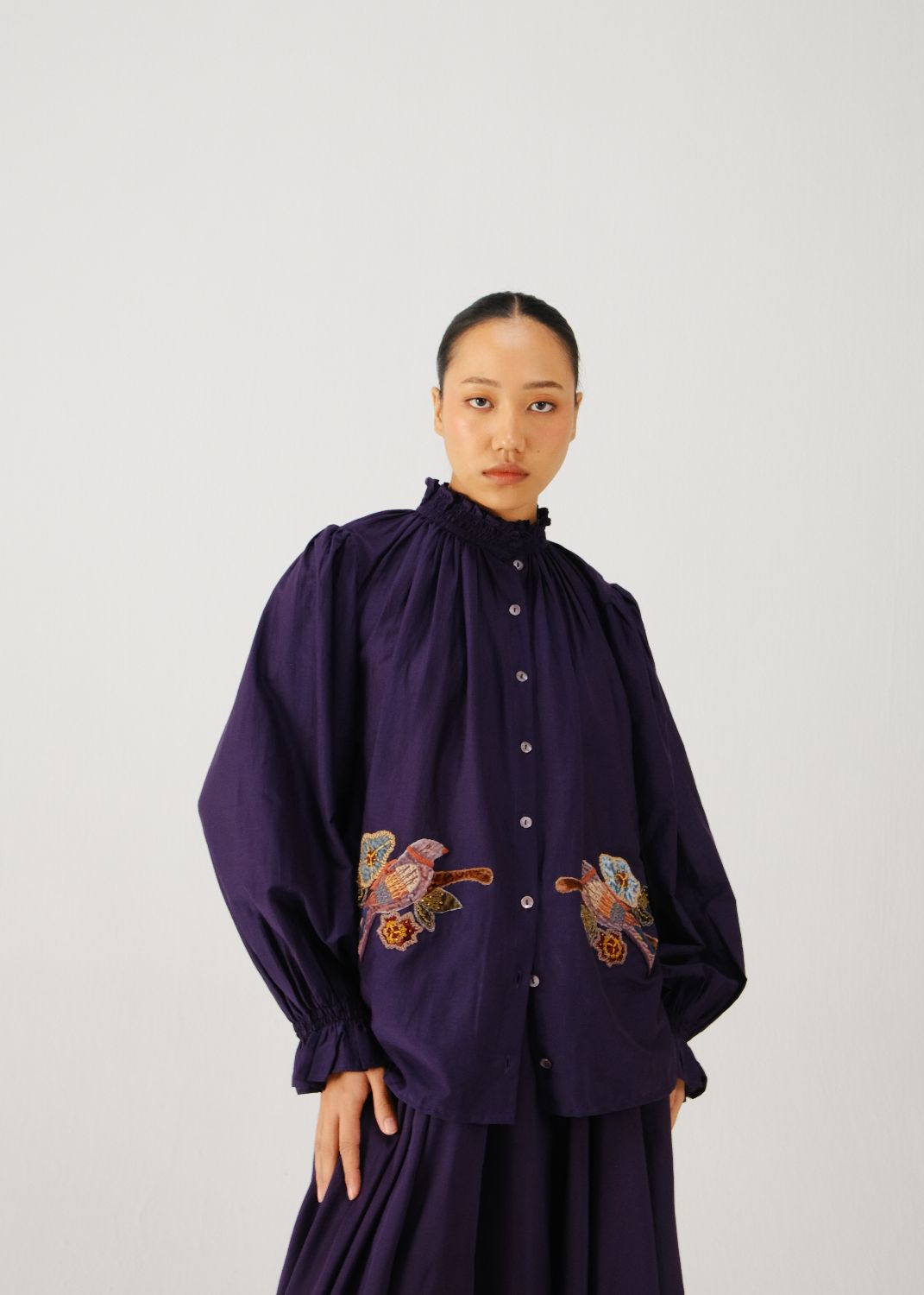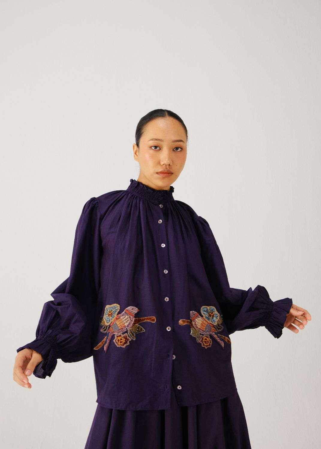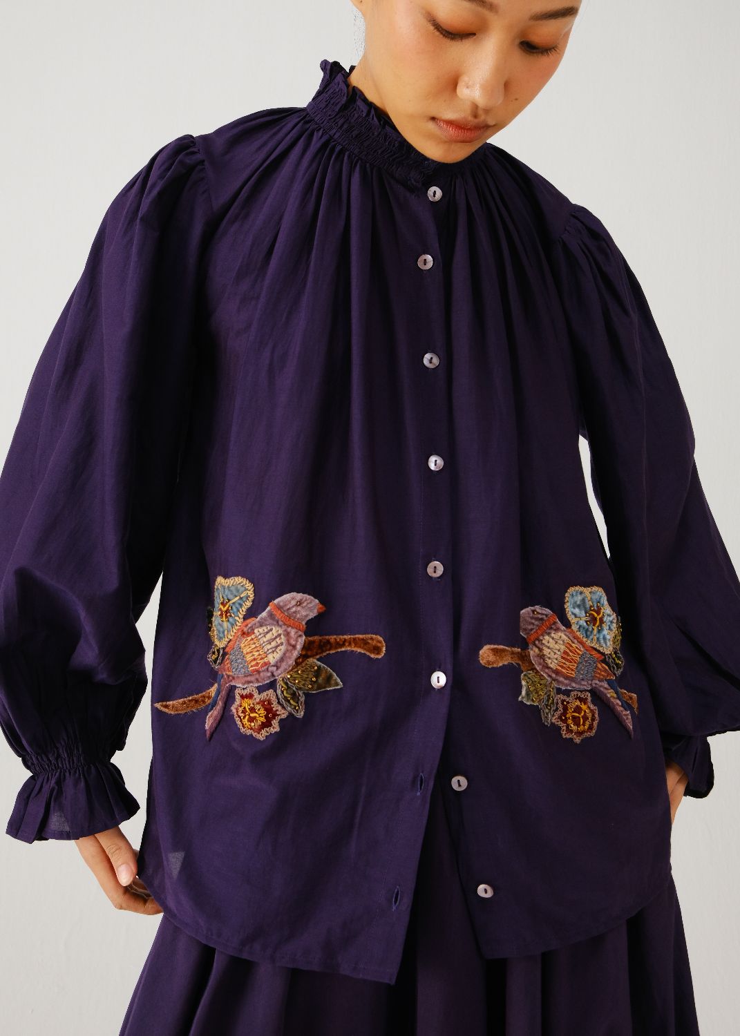 The Elsa Top, in ink parrot embroidery, features elasticated smocking at the neck and elasticated cuffs for a relaxed fit. It is finished with hand-embroidered buttons.