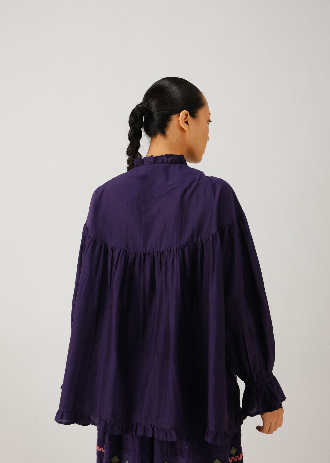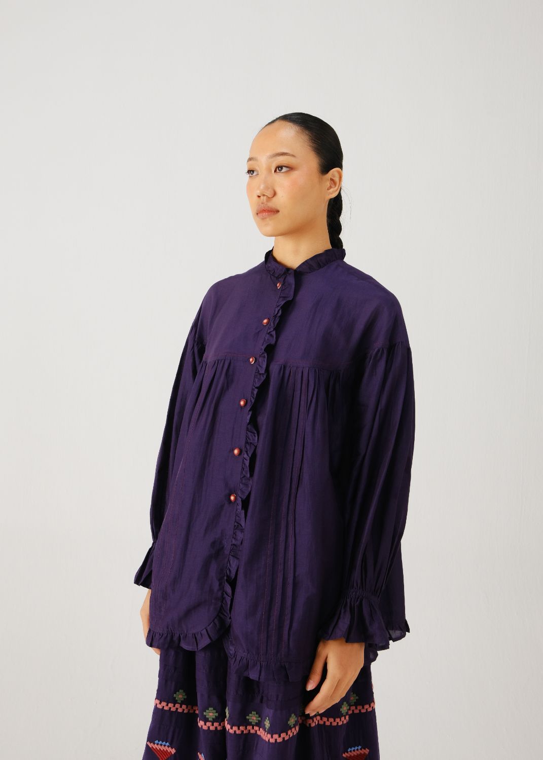 The Fiji Top is crafted in cotton-silk featuring contrast stitching, pintuck detailing, and elasticated cuffs. A frill collar runs along the placket cuff and hem finished with embroidered button details at the front opening.