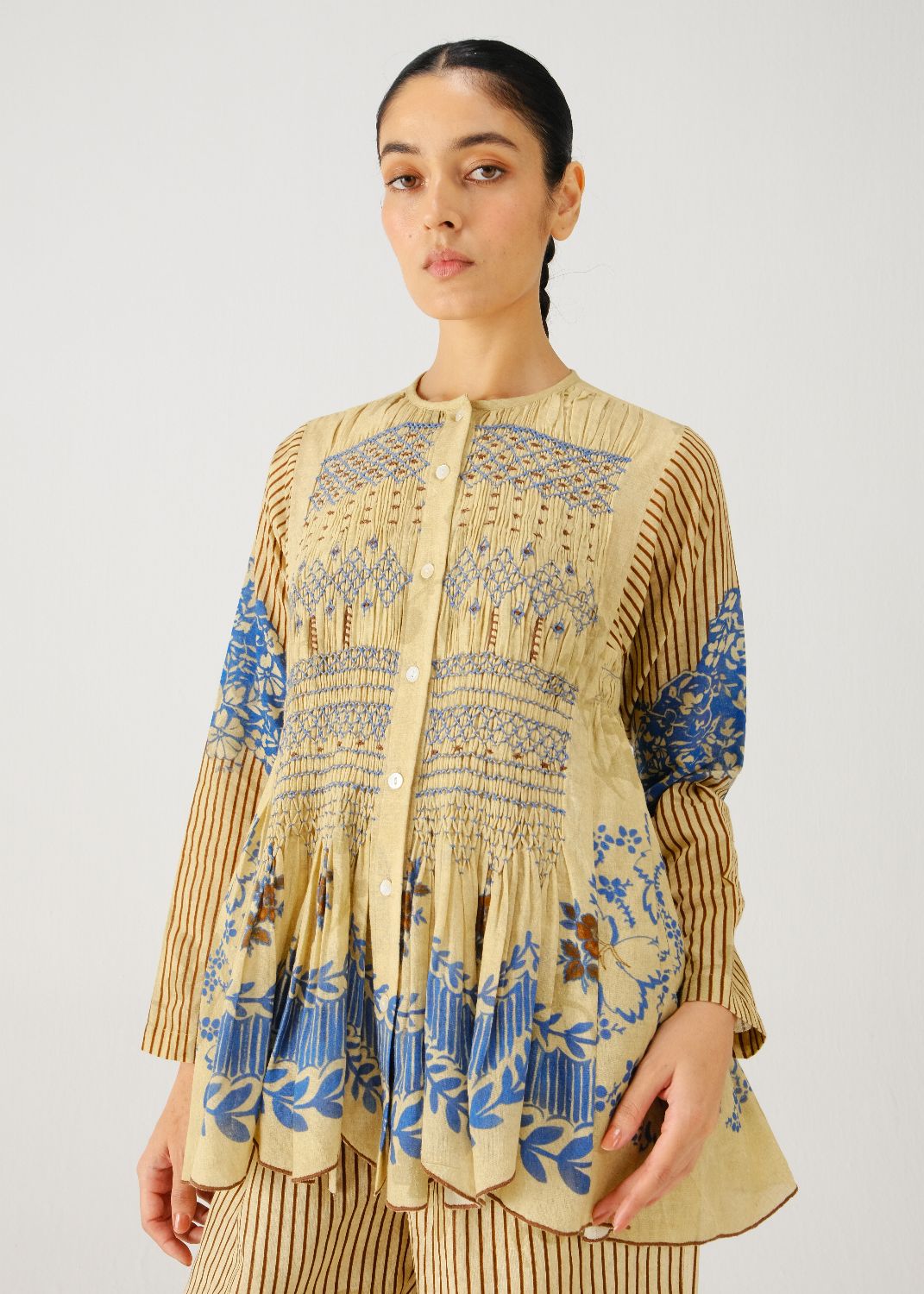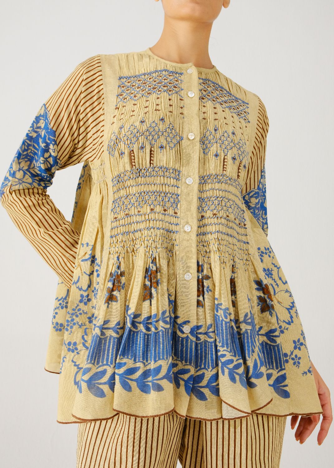 The Frida top is a relaxed silhouette made from pure cotton. The dress showcases a beautiful Bluebell print on the body, full-length sleeves. Delicate smocking on the yoke and gentle gathers on the sides add subtle volume and texture, while buttons run along the front for easy fastening.