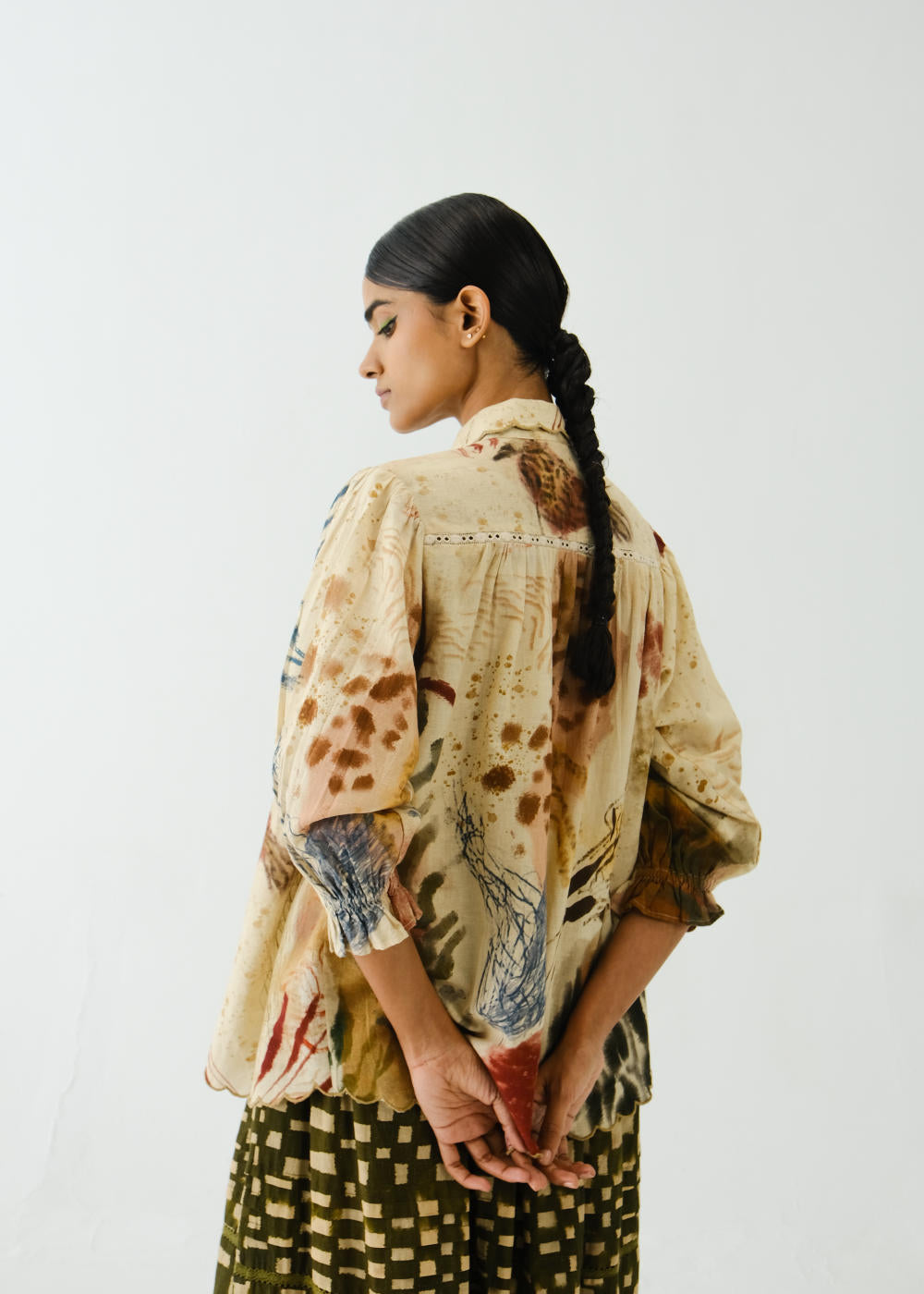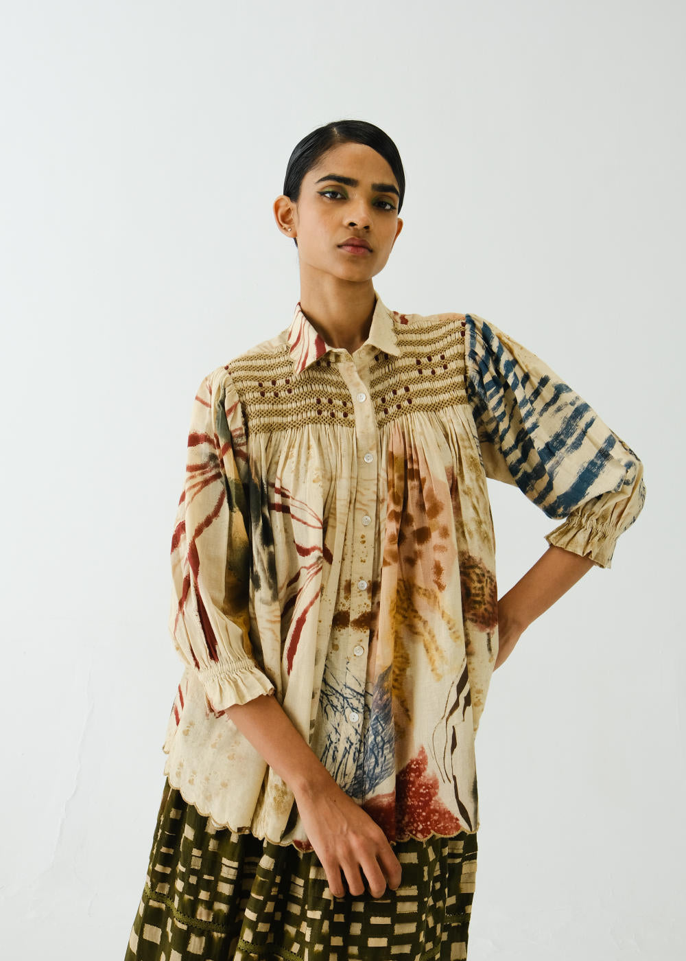 The Judy Shirt is a button-down silhouette that blends artisanal charm with effortless wearability. It features a delicately hand-smocked yoke that adds texture and structure, while ruffled elasticated cuffs create a soft, voluminous effect. A scalloped hem lends a feminine, intricate finish, making it a versatile piece that balances elegance with a touch of whimsy. Fabric : Cotton