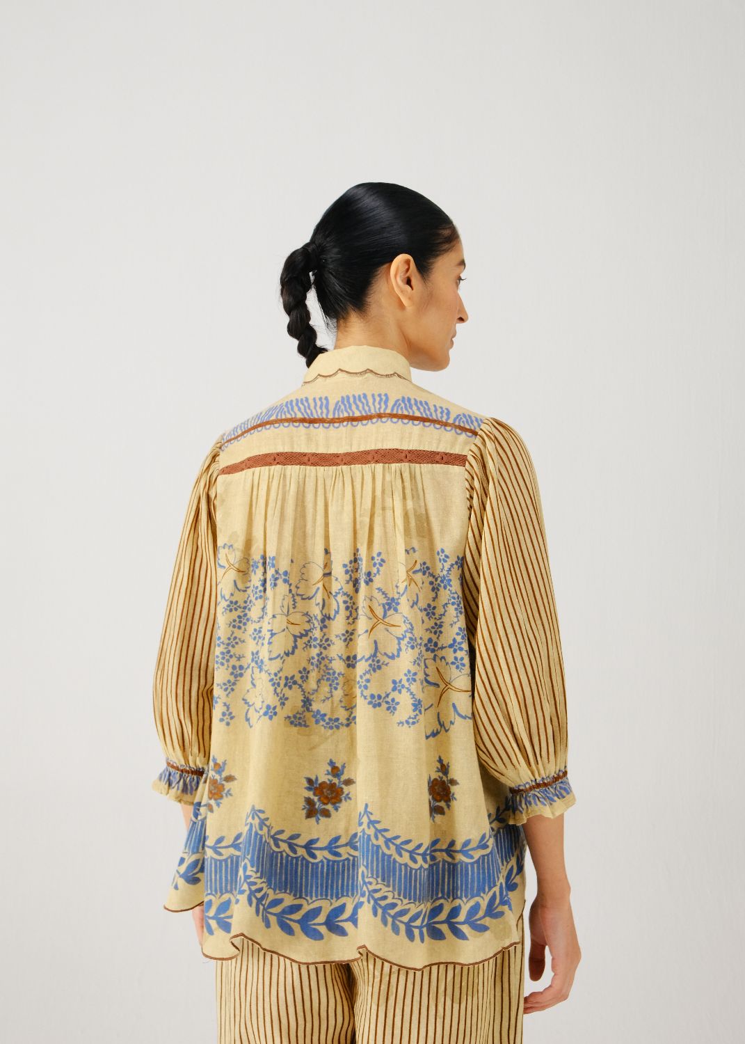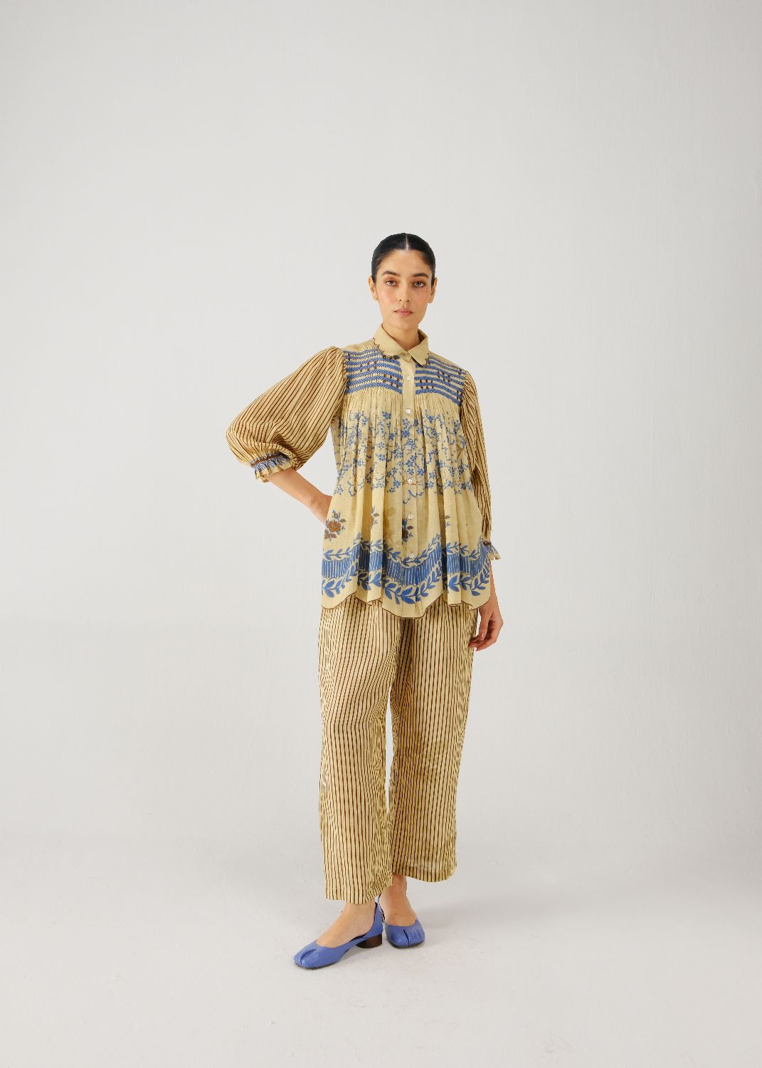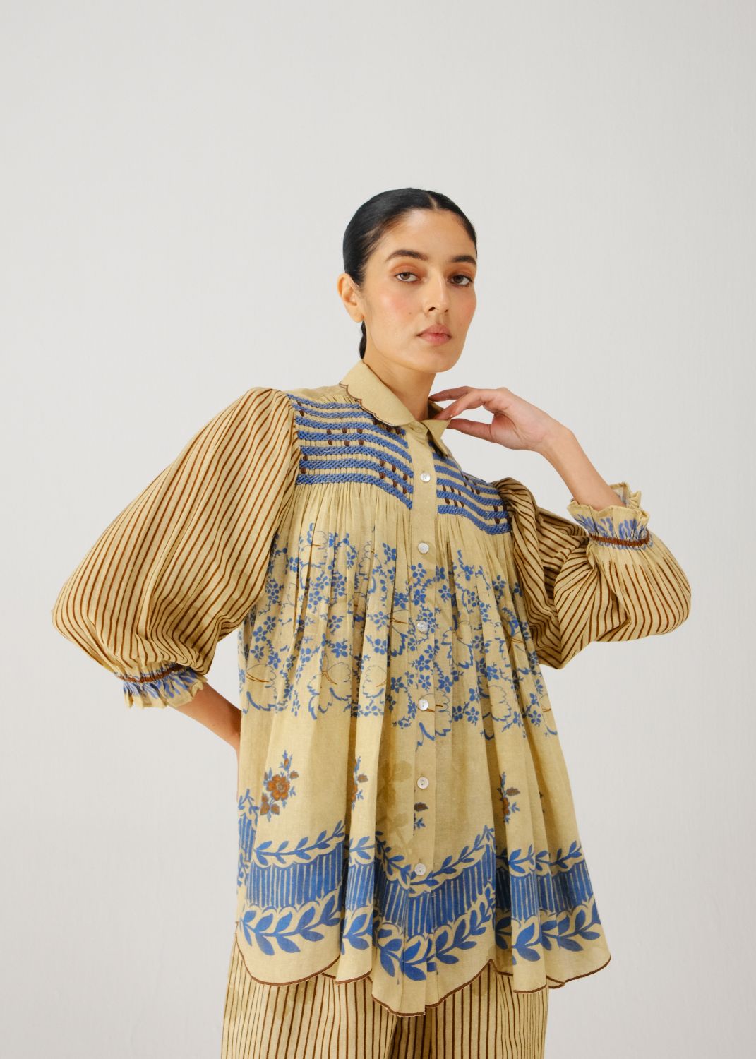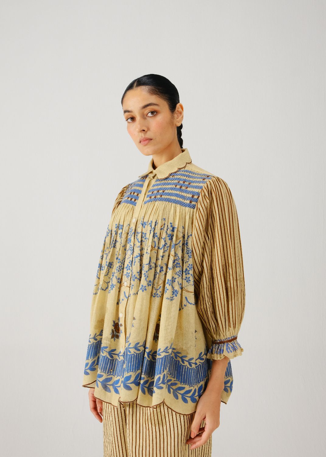 Made in pure cotton, the Judy Top is relaxed buttondown, A line silhouette featuring elegant smocking on the shoulders and scalloped edging collar and hem. The top has 3/4-length sleeves finished with elasticated cuffs for ease.