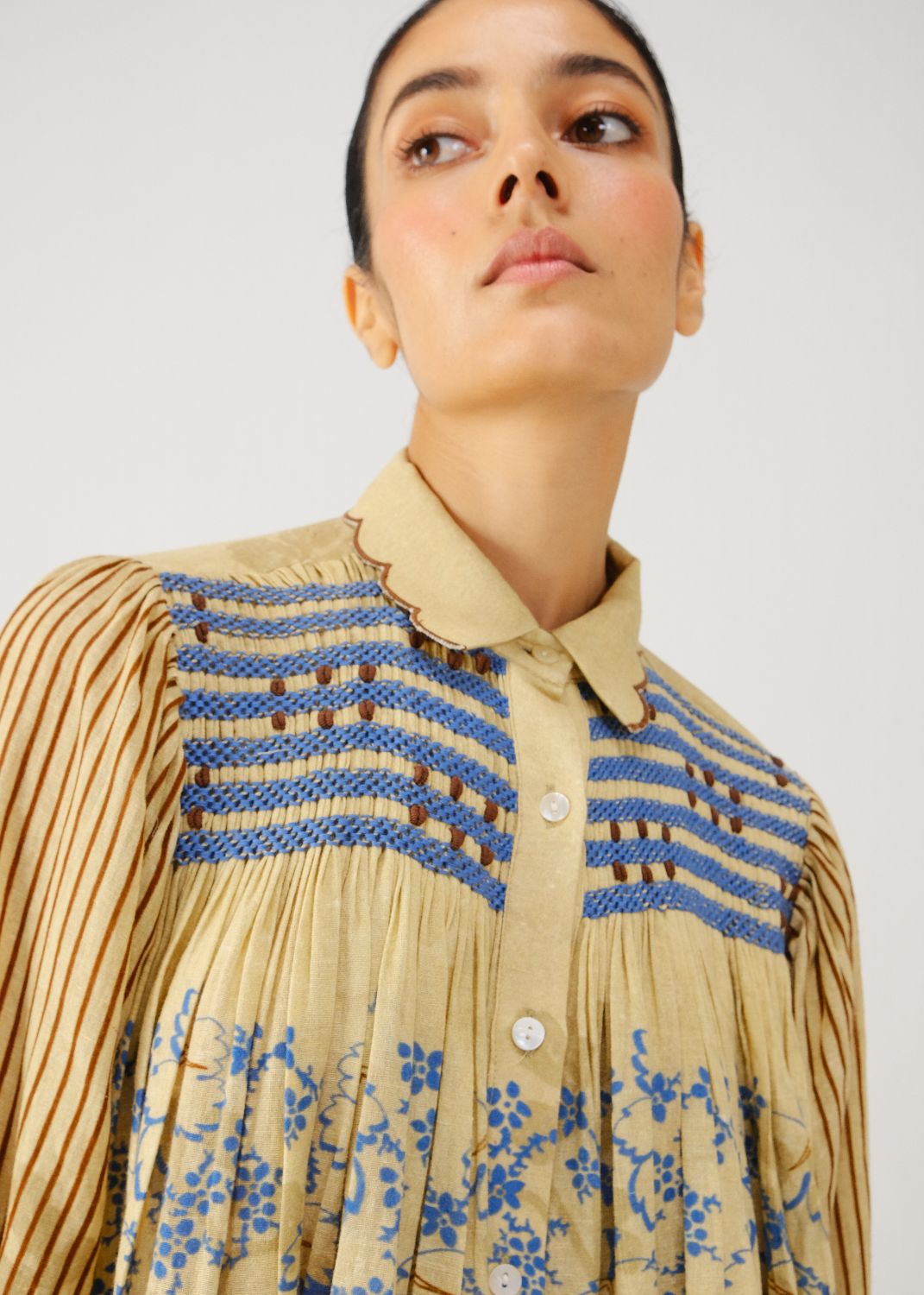 Details: Smocking on the yoke, gathers on the sides