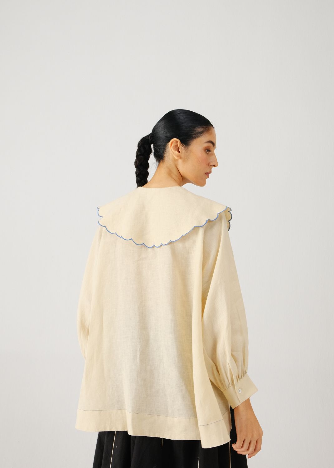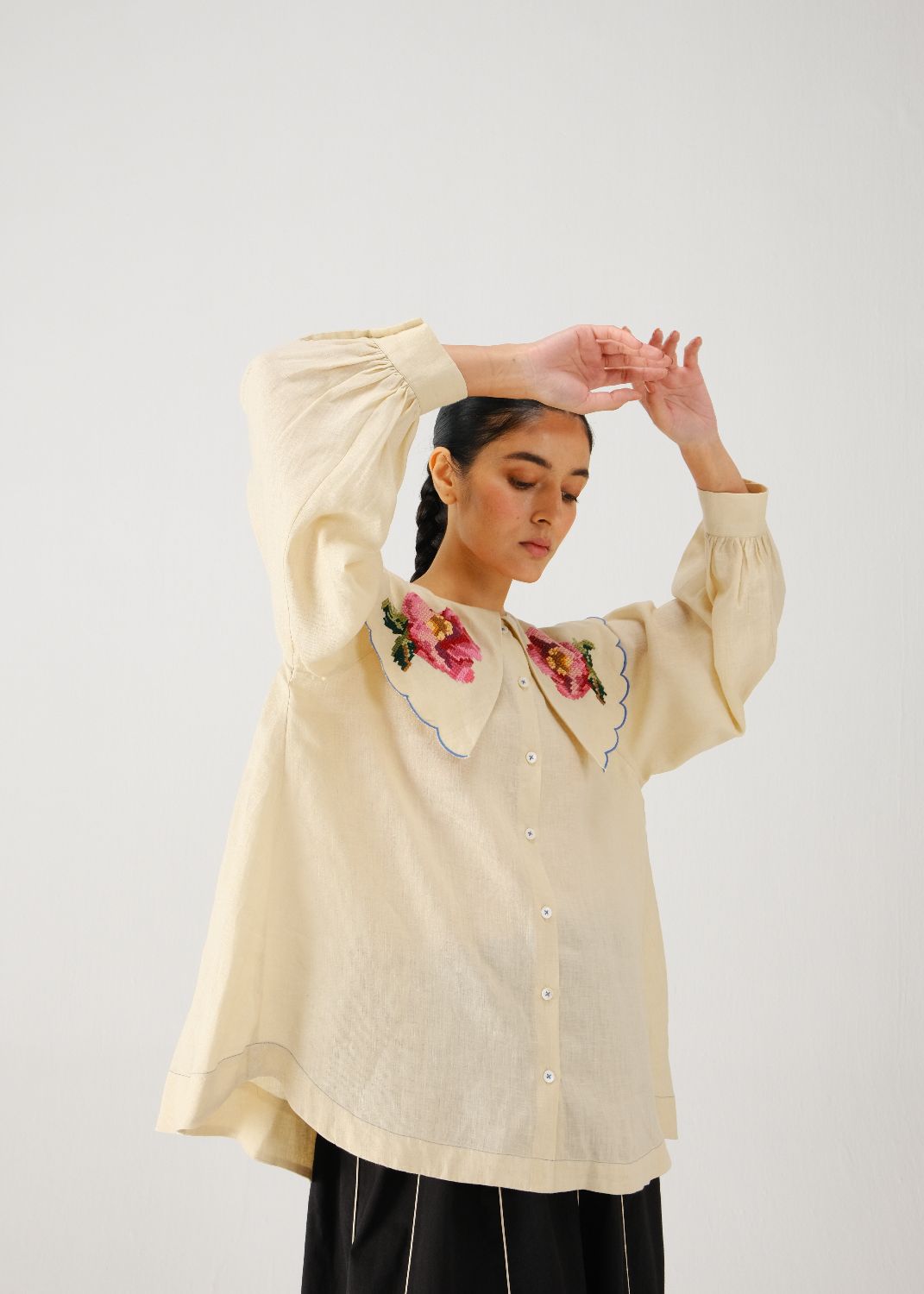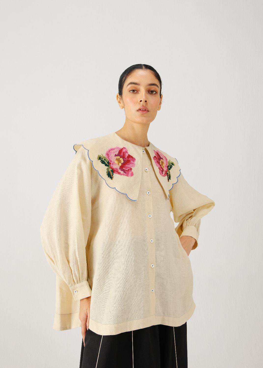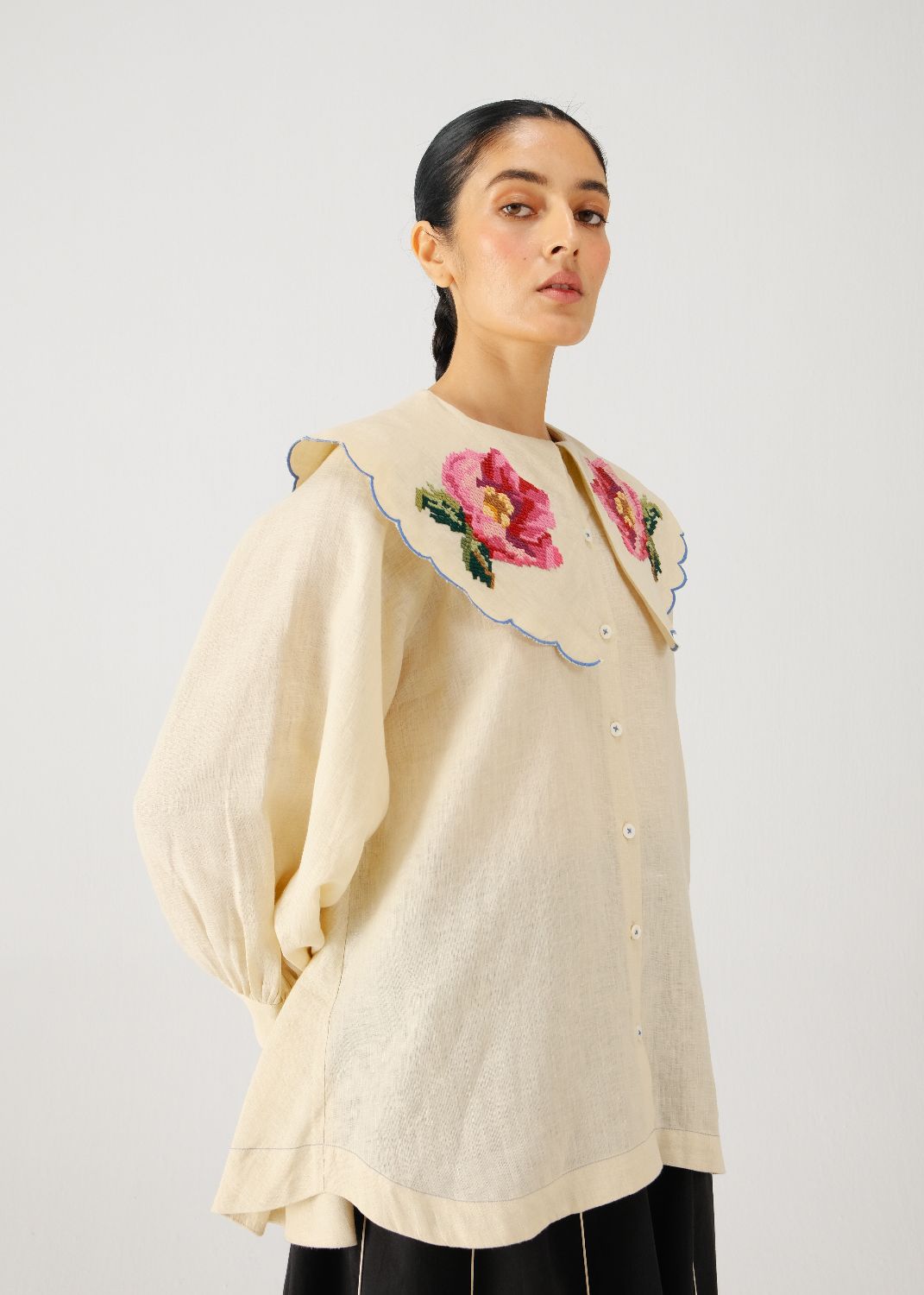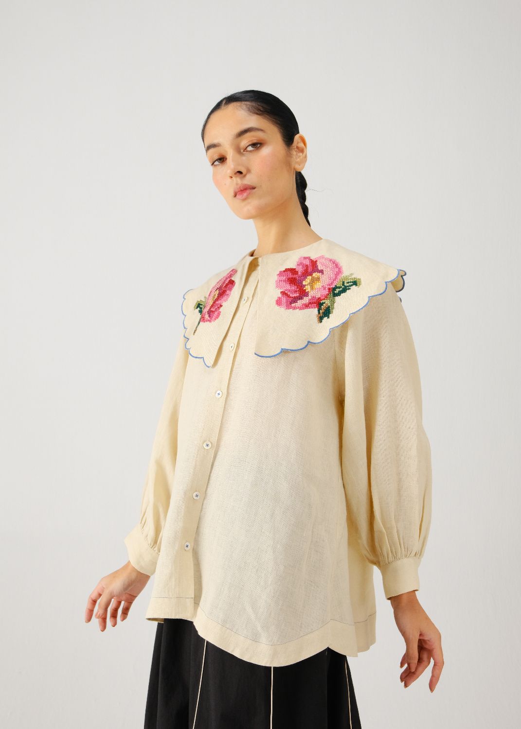 The Julia Top is a shirt made in linen with a Peter Pan collar. The collar has contrast scallop edging. The shirt has full sleeves with buttoned cuffs and a button-down front. A cross-stitch rose is hand-embroidered on the collar, adding a detail to the design.