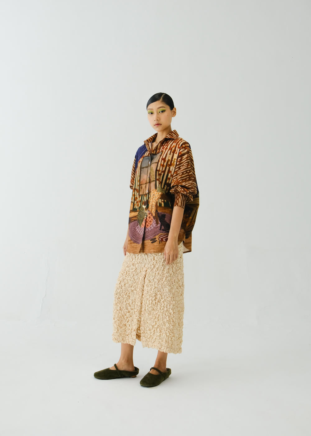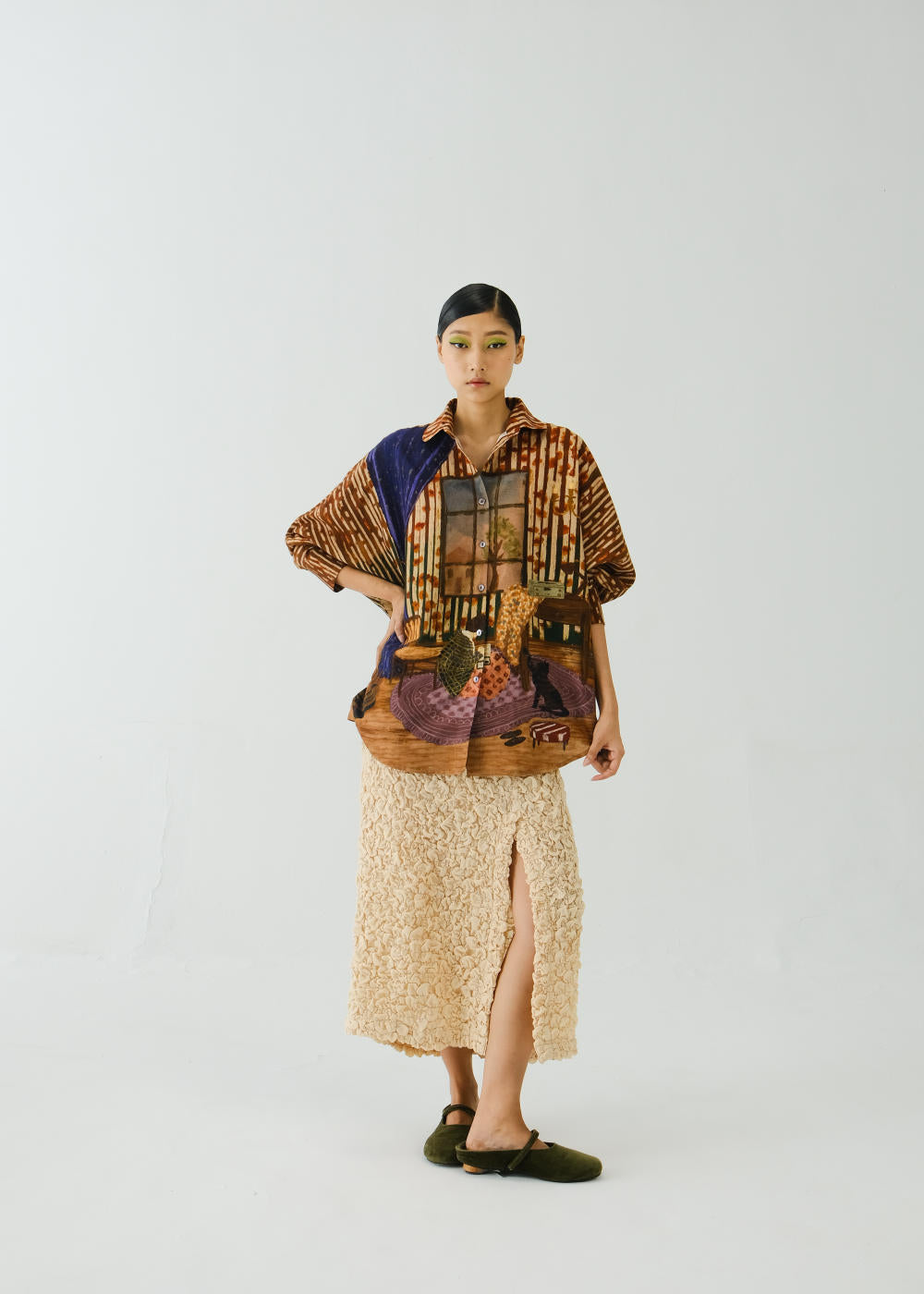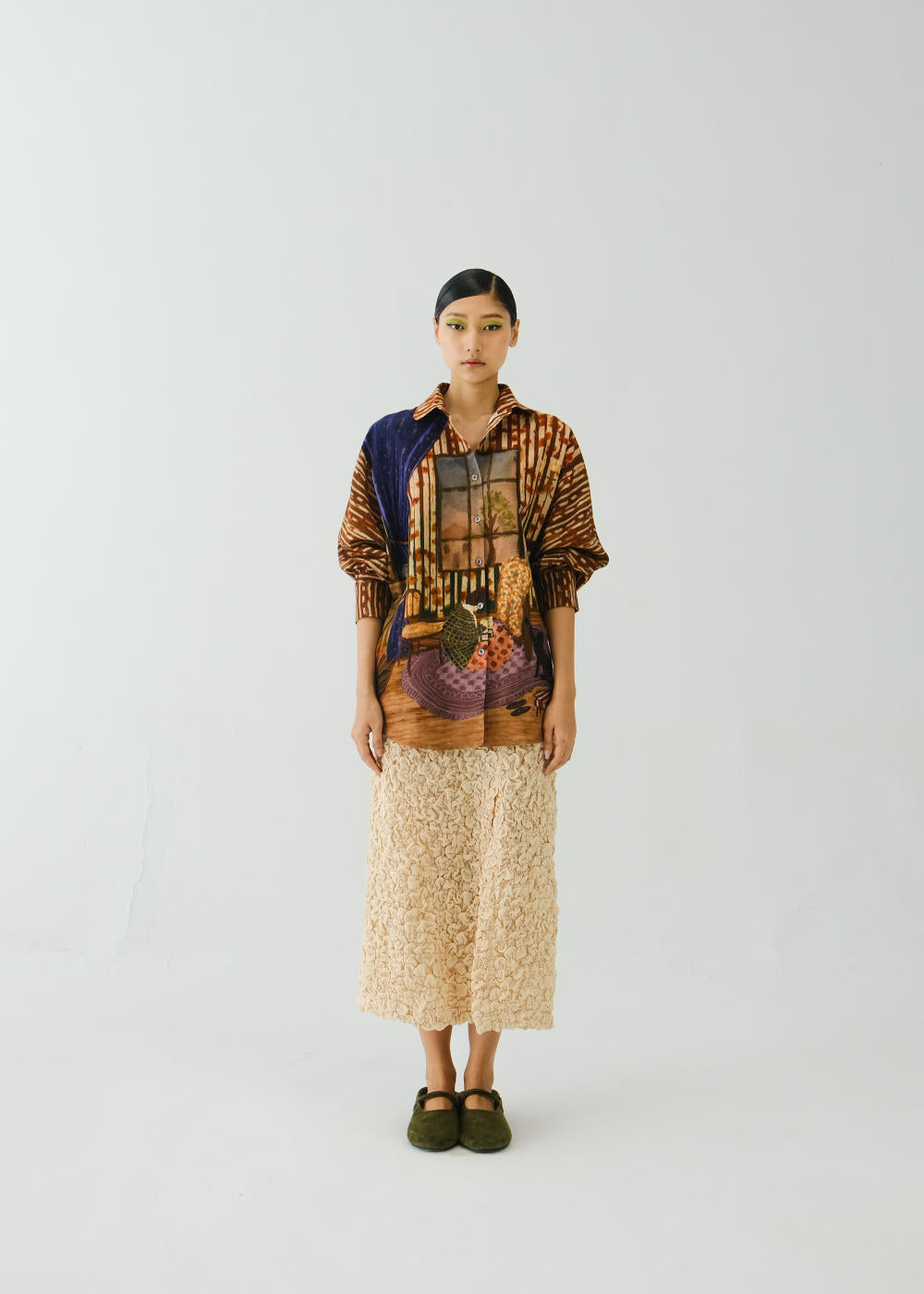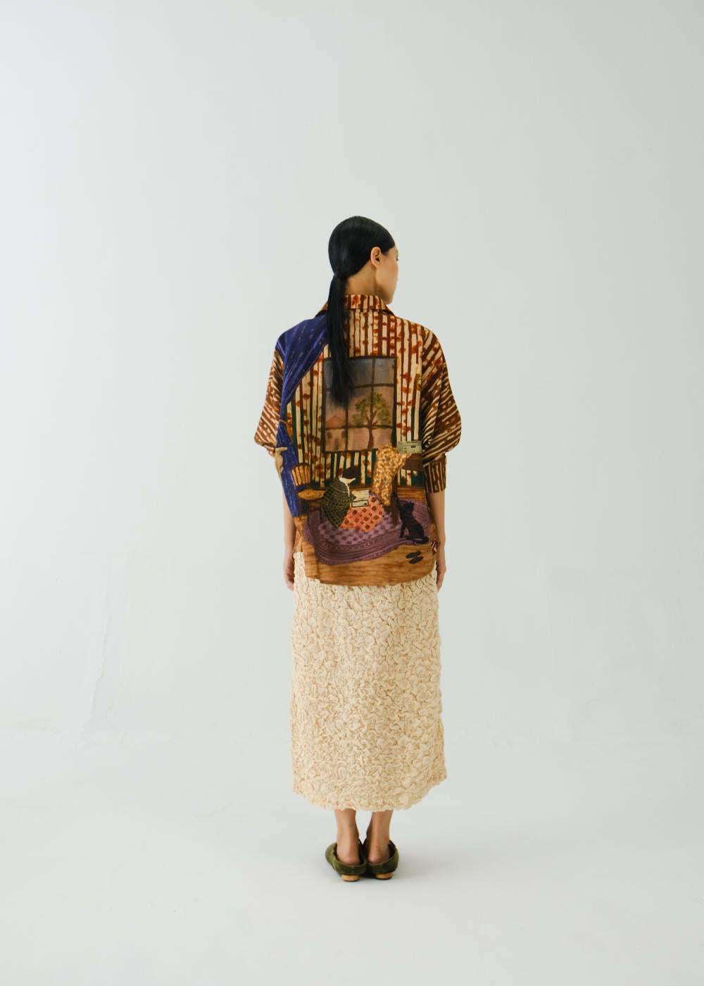 CORD blurs the line between art and attire in a way few labels dare to. Here, fabrics become canvases; illustrations—drawn by hand, steeped in imagination—flow across silhouettes that feel sculptural yet deeply wearable. Each piece has a texture of memory to it, as if it carries echoes of a past life, now reframed for a contemporary world.