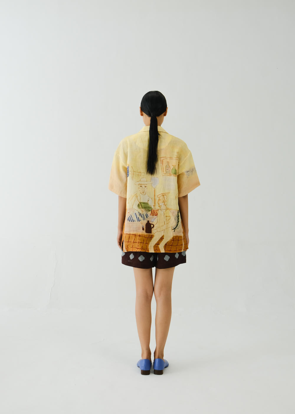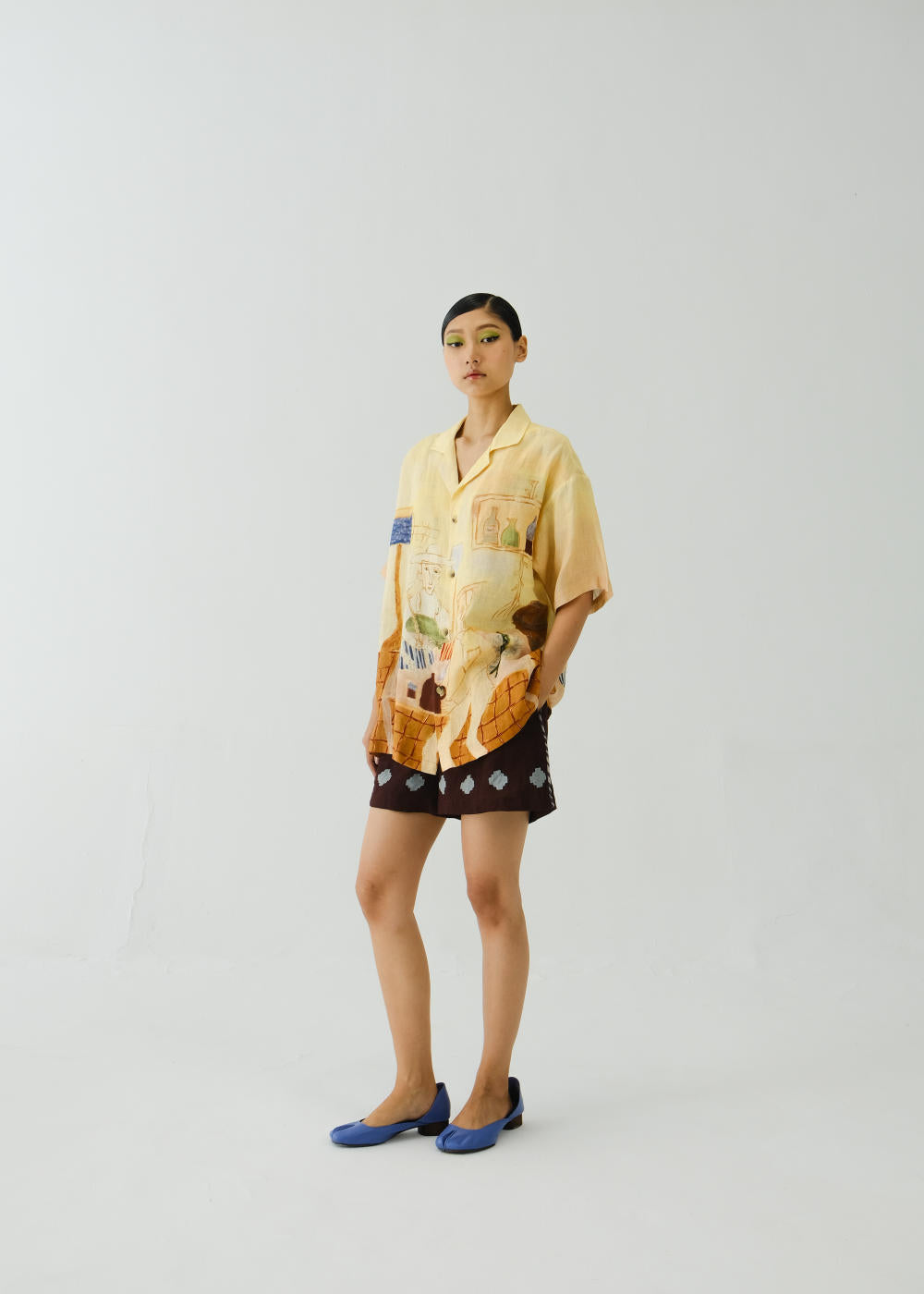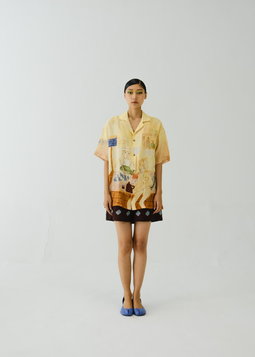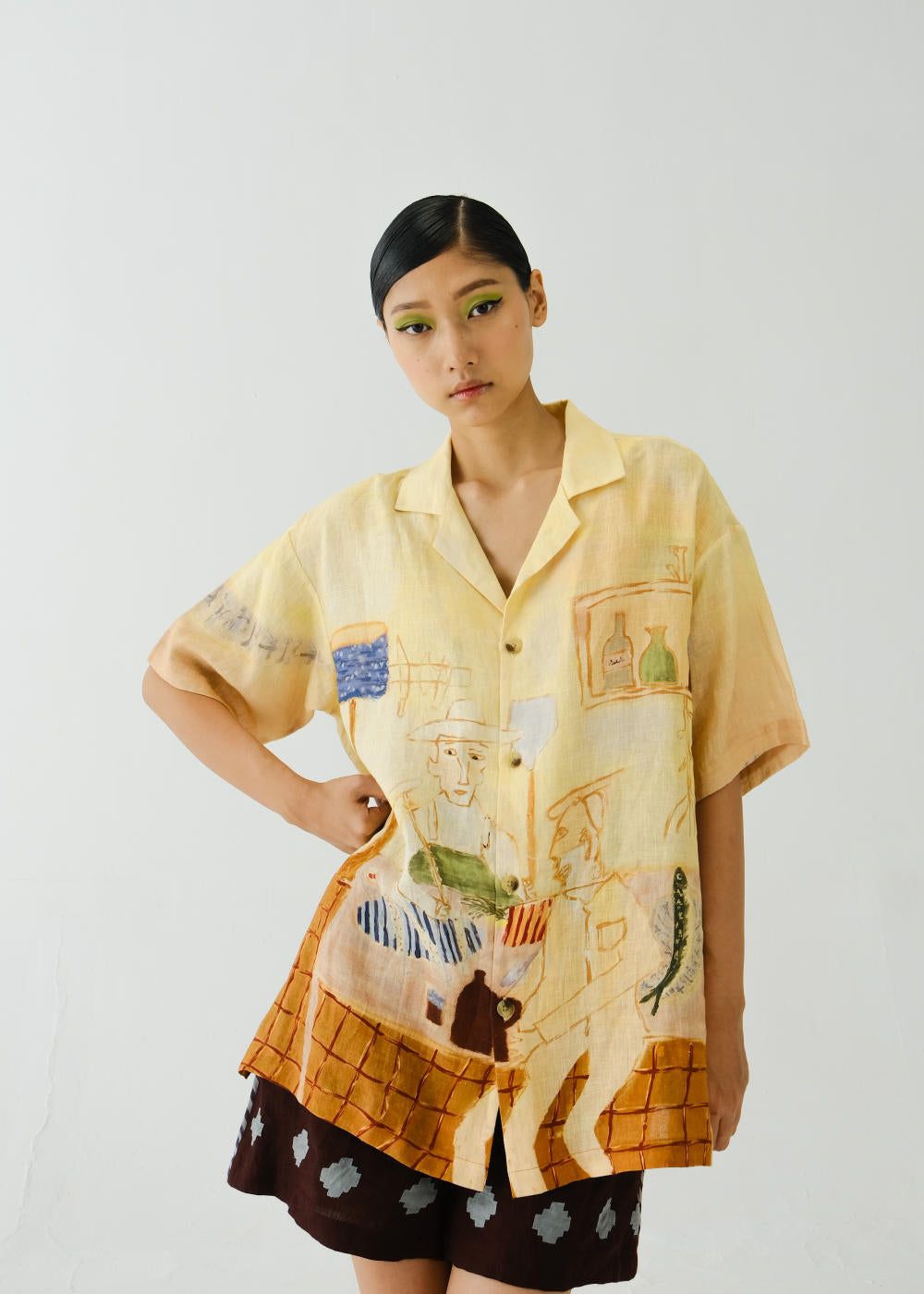 Boxy fit shirt made in 100% linen with collar and sleeve details, gives an oversized fit till a large size. Fabric : Linen