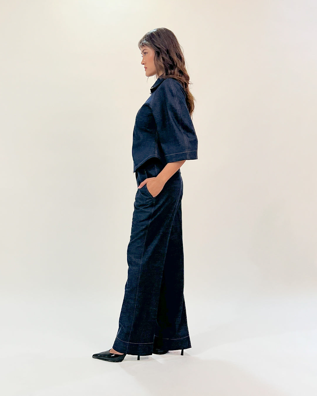 A modern take on classic style, this denim top features contrast top stitch and structured curve sleeves with two way full frontal zipper opening for adjustable styling. Fitted at waist, it flares out at the bottom creating a flattering and modern silhouette. Model wear size S model height is 5'8 garment length is 21"