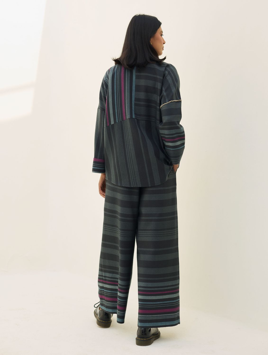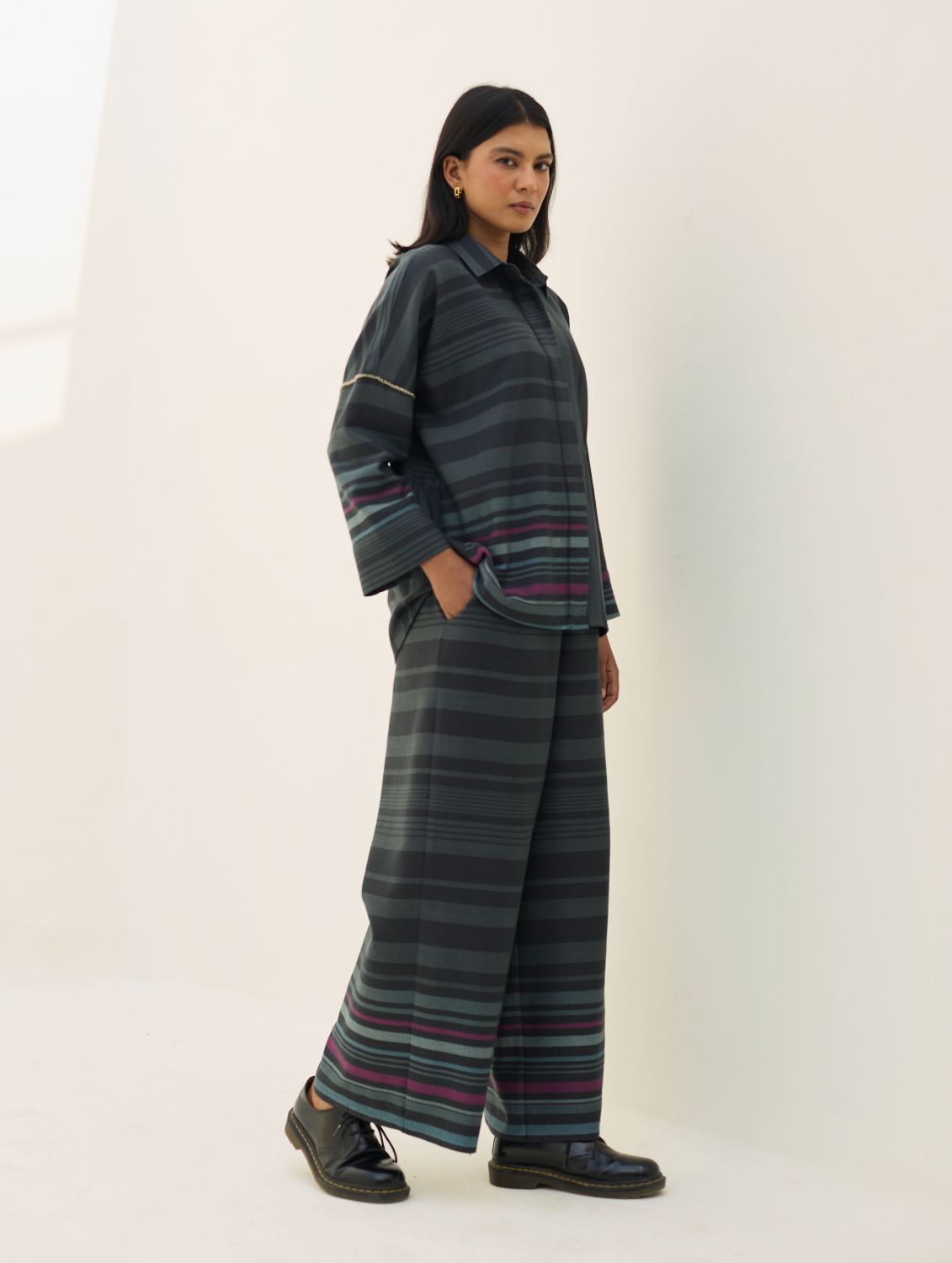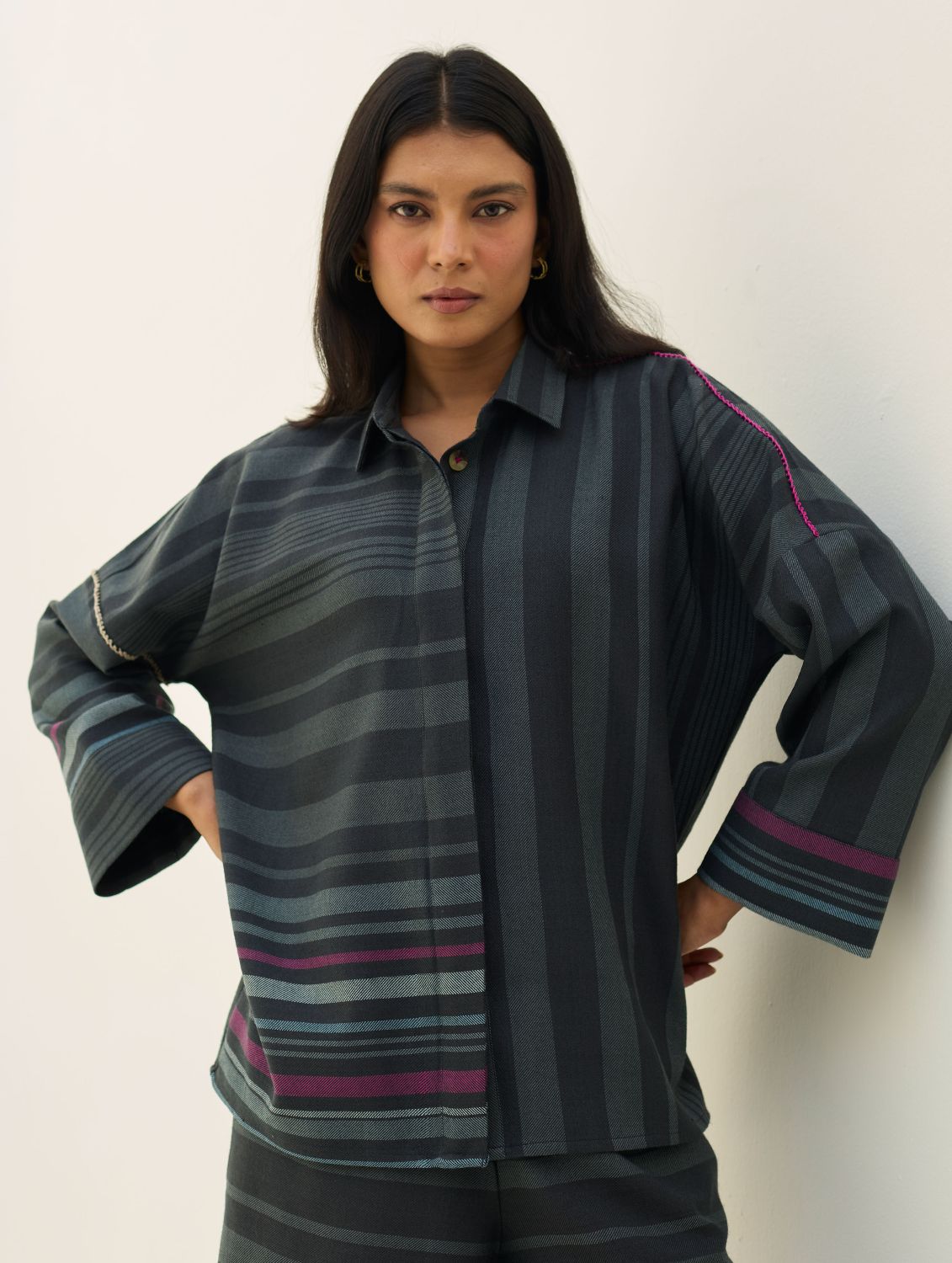 Shirts- The Ellen shirt is handcrafted in our yarn-dyed pure merino wool woven in two-toned checks with a fun multi-coloured striped border. Designed with relaxed dolman sleeves and a clean, concealed placket, Ellen offers a soft structured silhouette that is easy-to-wear and versatile. Woven multi-coloured vibrant stripes are placed thoughtfully on the bodice which is detailed hand-knotted pop-coloured stitch detailing. Ellen is one of our perennial favourites to layer over your favourite turtleneck sweater or pair over denims or our woven merino wool trousers.