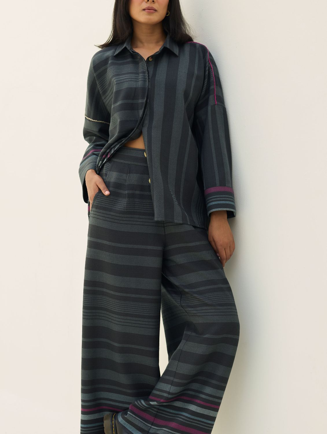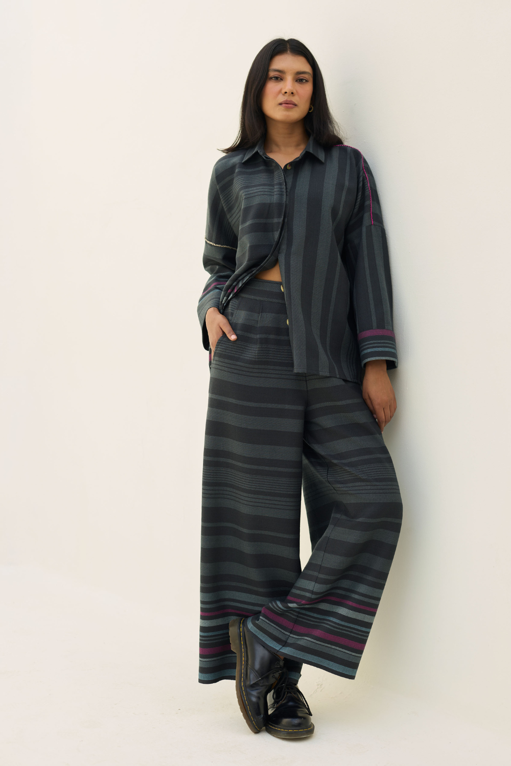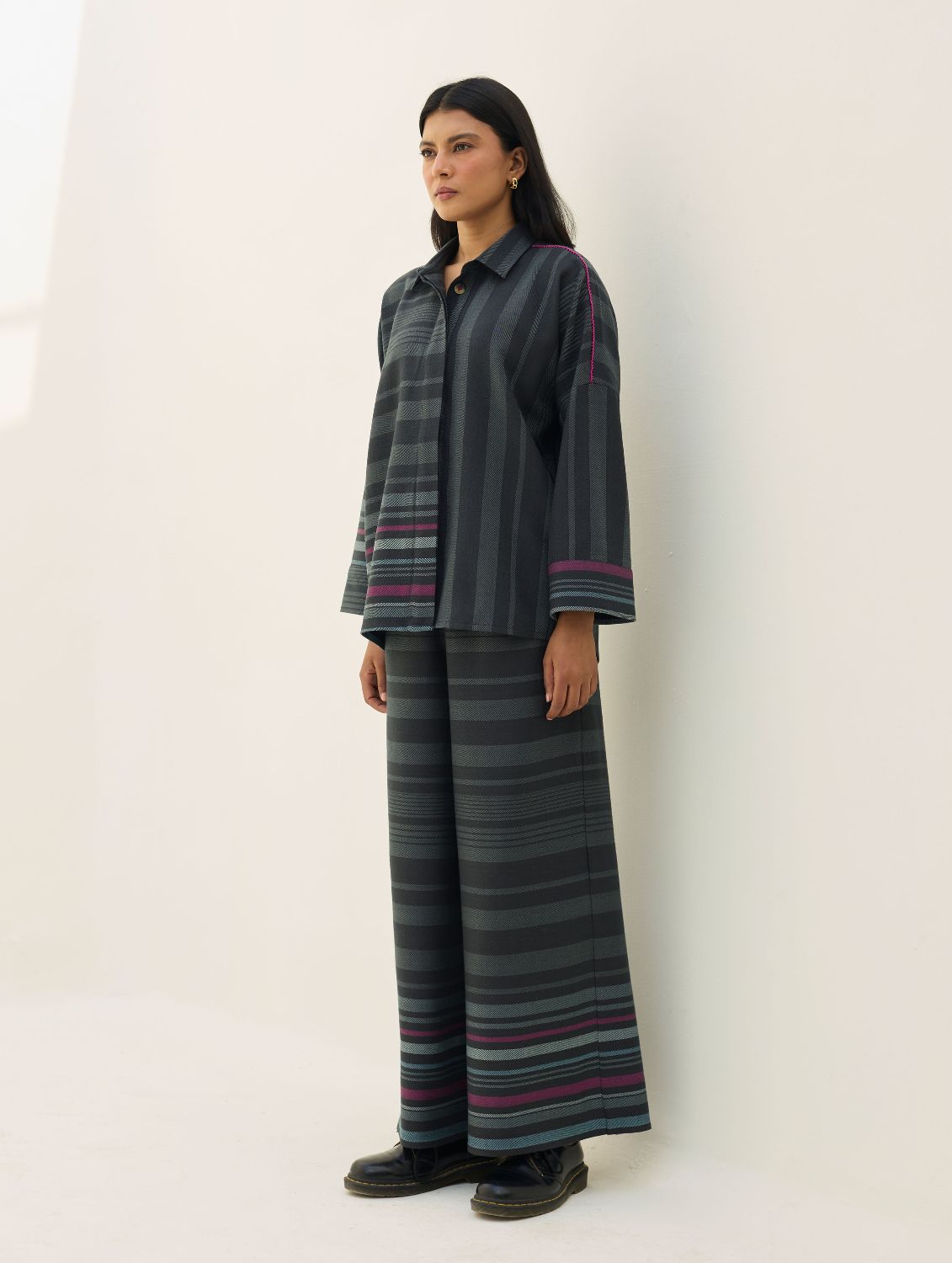 Shirts- The Ellen shirt is handcrafted in our yarn-dyed pure merino wool woven in two-toned checks with a fun multi-coloured striped border. Designed with relaxed dolman sleeves and a clean, concealed placket, Ellen offers a soft structured silhouette that is easy-to-wear and versatile. Woven multi-coloured vibrant stripes are placed thoughtfully on the bodice which is detailed hand-knotted pop-coloured stitch detailing. Ellen is one of our perennial favourites to layer over your favourite turtleneck sweater or pair over denims or our woven merino wool trousers.