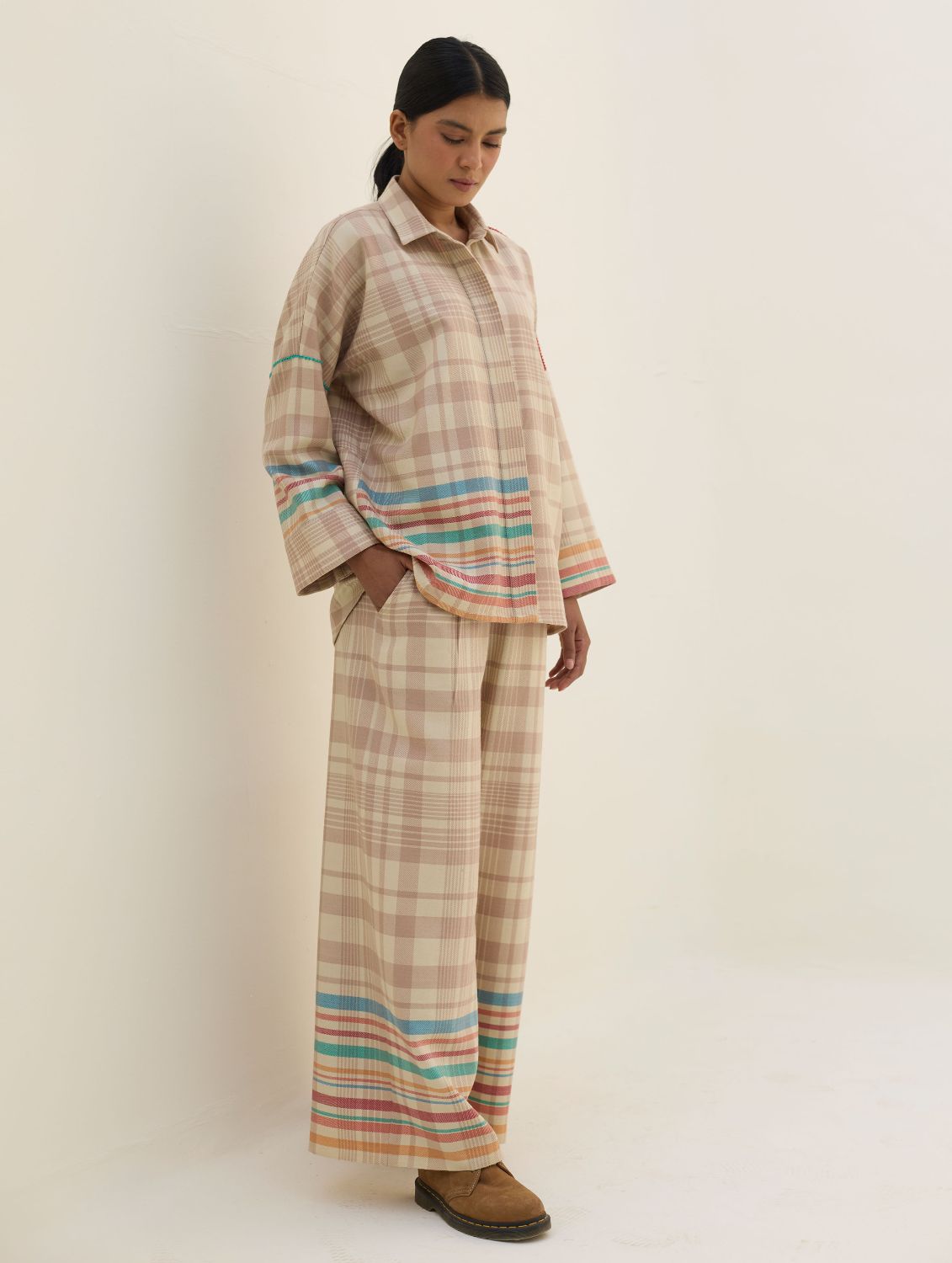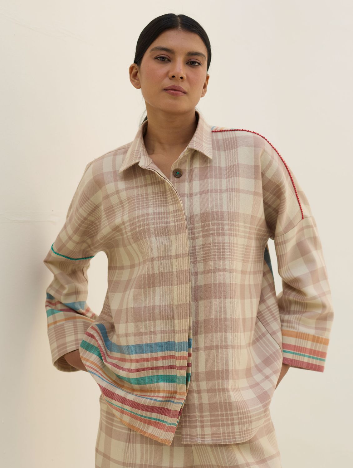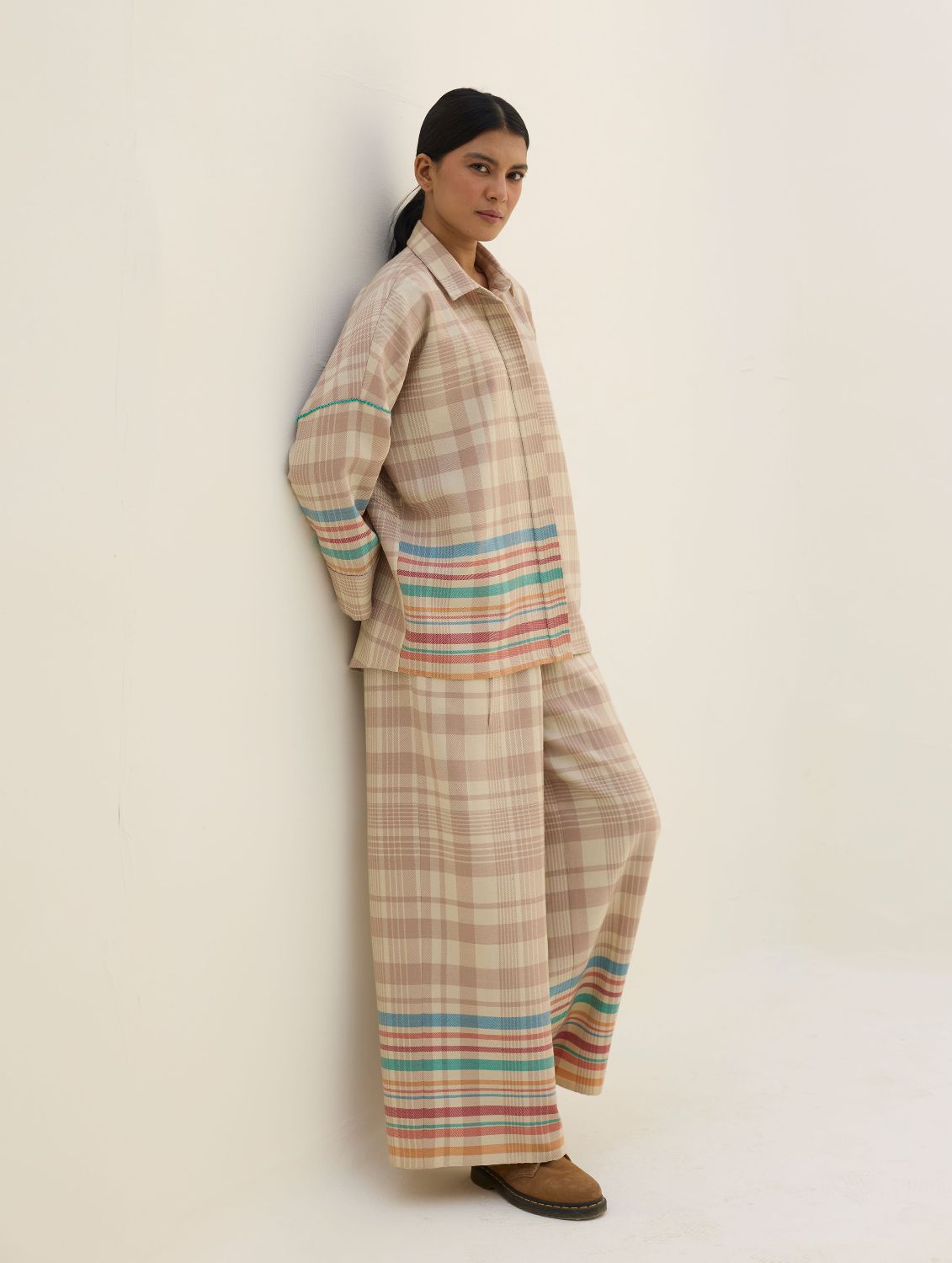 The Ellen shirt is handcrafted in our yarn-dyed pure merino wool woven in two-toned checks with a fun multi-coloured striped border. Designed with relaxed dolman sleeves and a clean, concealed placket, Ellen offers a soft structured silhouette that is easy-to-wear and versatile. Woven multi-coloured vibrant stripes are placed thoughtfully on the bodice which is detailed hand-knotted pop-coloured stitch detailing. Ellen is one of our perennial favourites to layer over your favourite turtleneck sweater or pair over denims or our woven merino wool trousers.