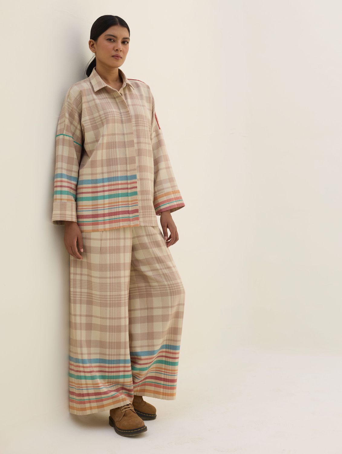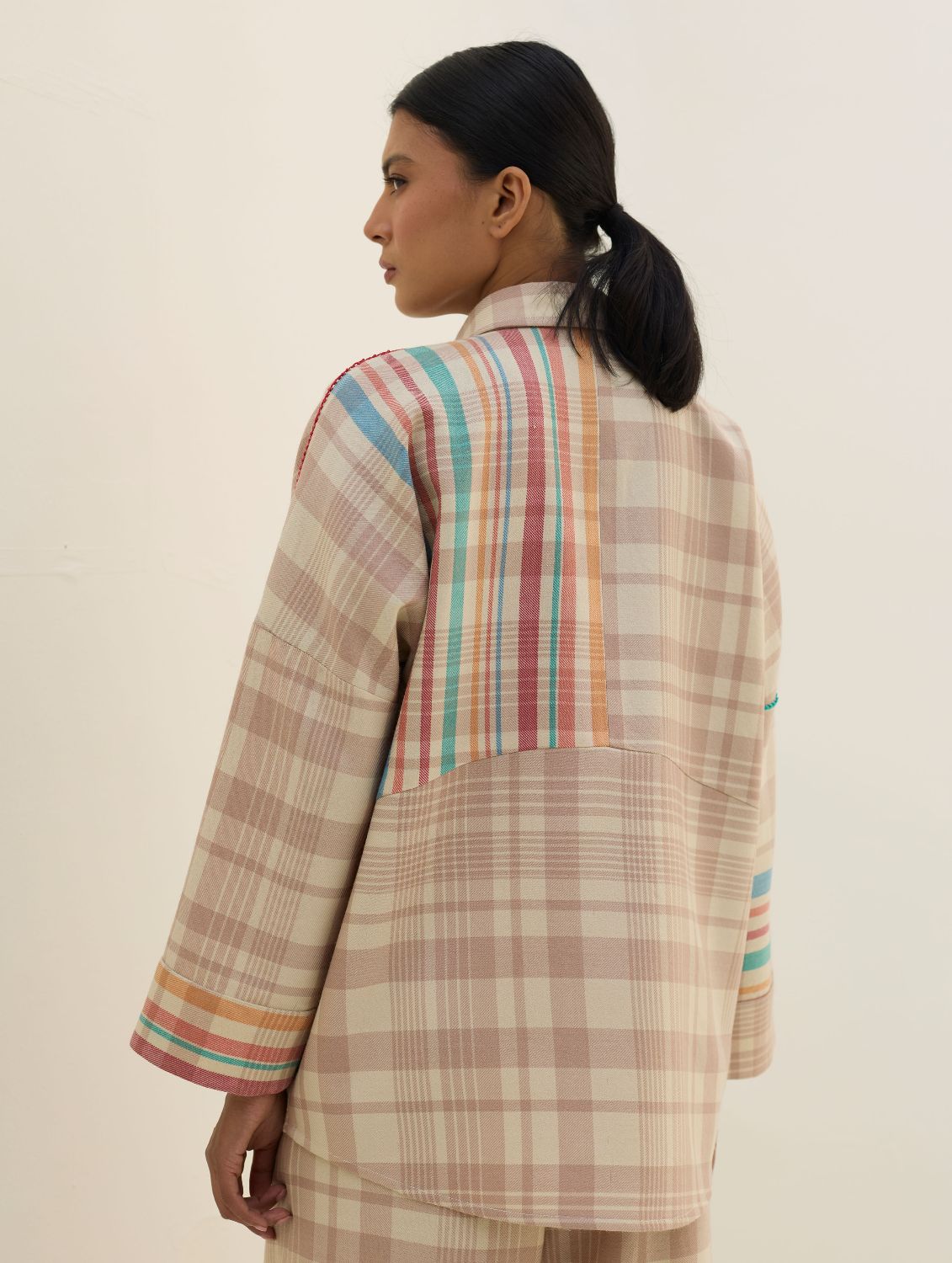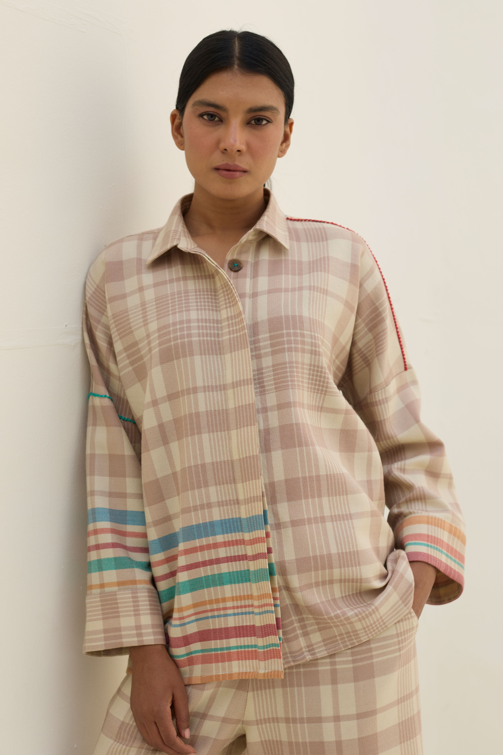 The Ellen shirt is handcrafted in our yarn-dyed pure merino wool woven in two-toned checks with a fun multi-coloured striped border. Designed with relaxed dolman sleeves and a clean, concealed placket, Ellen offers a soft structured silhouette that is easy-to-wear and versatile. Woven multi-coloured vibrant stripes are placed thoughtfully on the bodice which is detailed hand-knotted pop-coloured stitch detailing. Ellen is one of our perennial favourites to layer over your favourite turtleneck sweater or pair over denims or our woven merino wool trousers.